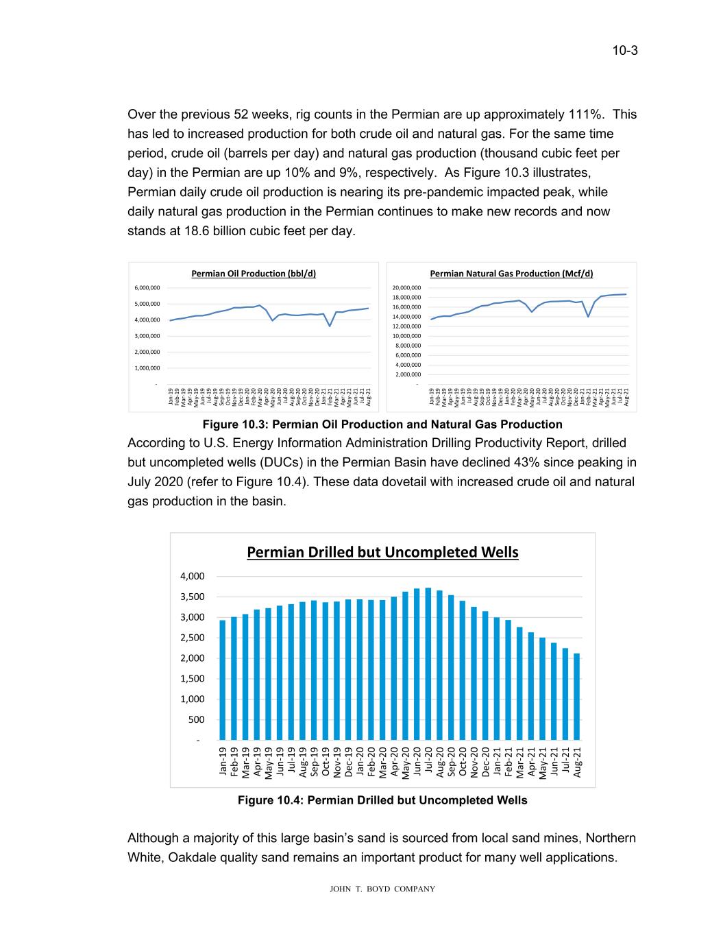 10-3 JOHN T. BOYD COMPANY Over the previous 52 weeks, rig counts in the Permian are up approximately 111%. This has led to increased production for both crude oil and natural gas. For the same time period, crude oil (barrels per day) and natural gas production (thousand cubic feet per day) in the Permian are up 10% and 9%, respectively. As Figure 10.3 illustrates, Permian daily crude oil production is nearing its pre-pandemic impacted peak, while daily natural gas production in the Permian continues to make new records and now stands at 18.6 billion cubic feet per day. Figure 10.3: Permian Oil Production and Natural Gas Production According to U.S. Energy Information Administration Drilling Productivity Report, drilled but uncompleted wells (DUCs) in the Permian Basin have declined 43% since peaking in July 2020 (refer to Figure 10.4). These data dovetail with increased crude oil and natural gas production in the basin. Figure 10.4: Permian Drilled but Uncompleted Wells Although a majority of this large basin’s sand is sourced from local sand mines, Northern White, Oakdale quality sand remains an important product for many well applications. - 1,000,000 2,000,000 3,000,000 4,000,000 5,000,000 6,000,000 Ja n- 19 Fe b- 19 M ar -1 9 Ap r- 19 M ay -1 9 Ju n- 19 Ju l-1 9 Au g- 19 Se p- 19 O ct -1 9 N ov -1 9 De c- 19 Ja n- 20 Fe b- 20 M ar -2 0 Ap r- 20 M ay -2 0 Ju n- 20 Ju l-2 0 Au g- 20 Se p- 20 O ct -2 0 N ov -2 0 De c- 20 Ja n- 21 Fe b- 21 M ar -2 1 Ap r- 21 M ay -2 1 Ju n- 21 Ju l-2 1 Au g- 21 Permian Oil Production (bbl/d) - 2,000,000 4,000,000 6,000,000 8,000,000 10,000,000 12,000,000 14,000,000 16,000,000 18,000,000 20,000,000 Ja n- 19 Fe b- 19 M ar -1 9 Ap r- 19 M ay -1 9 Ju n- 19 Ju l-1 9 Au g- 19 Se p- 19 O ct -1 9 N ov -1 9 De c- 19 Ja n- 20 Fe b- 20 M ar -2 0 Ap r- 20 M ay -2 0 Ju n- 20 Ju l-2 0 Au g- 20 Se p- 20 O ct -2 0 N ov -2 0 De c- 20 Ja n- 21 Fe b- 21 M ar -2 1 Ap r- 21 M ay -2 1 Ju n- 21 Ju l-2 1 Au g- 21 Permian Natural Gas Production (Mcf/d) - 500 1,000 1,500 2,000 2,500 3,000 3,500 4,000 Ja n- 19 Fe b- 19 M ar -1 9 Ap r- 19 M ay -1 9 Ju n- 19 Ju l-1 9 Au g- 19 Se p- 19 O ct -1 9 N ov -1 9 De c- 19 Ja n- 20 Fe b- 20 M ar -2 0 Ap r- 20 M ay -2 0 Ju n- 20 Ju l-2 0 Au g- 20 Se p- 20 O ct -2 0 N ov -2 0 De c- 20 Ja n- 21 Fe b- 21 M ar -2 1 Ap r- 21 M ay -2 1 Ju n- 21 Ju l-2 1 Au g- 21 Permian Drilled but Uncompleted Wells