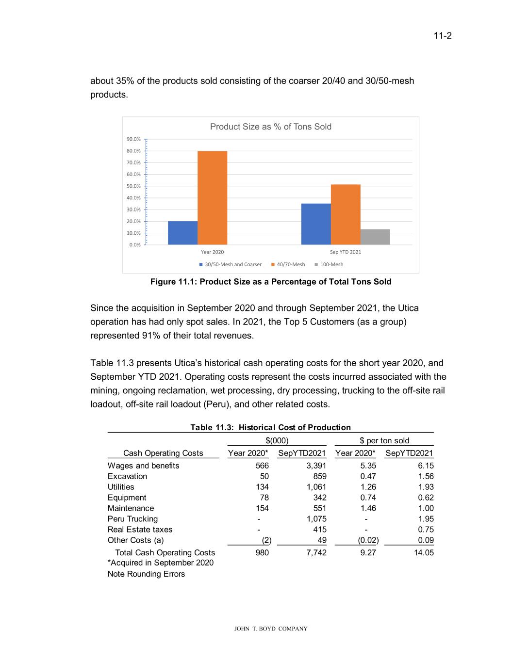 11-2 JOHN T. BOYD COMPANY about 35% of the products sold consisting of the coarser 20/40 and 30/50-mesh products. Figure 11.1: Product Size as a Percentage of Total Tons Sold Since the acquisition in September 2020 and through September 2021, the Utica operation has had only spot sales. In 2021, the Top 5 Customers (as a group) represented 91% of their total revenues. Table 11.3 presents Utica’s historical cash operating costs for the short year 2020, and September YTD 2021. Operating costs represent the costs incurred associated with the mining, ongoing reclamation, wet processing, dry processing, trucking to the off-site rail loadout, off-site rail loadout (Peru), and other related costs. $(000) $ per ton sold Cash Operating Costs Year 2020* SepYTD2021 Year 2020* SepYTD2021 Wages and benefits 566 3,391 5.35 6.15 Excavation 50 859 0.47 1.56 Utilities 134 1,061 1.26 1.93 Equipment 78 342 0.74 0.62 Maintenance 154 551 1.46 1.00 Peru Trucking - 1,075 - 1.95 Real Estate taxes - 415 - 0.75 Other Costs (a) (2) 49 (0.02) 0.09 Total Cash Operating Costs 980 7,742 9.27 14.05 Note Rounding Errors *Acquired in September 2020 Table 11.3: Historical Cost of Production 0.0% 10.0% 20.0% 30.0% 40.0% 50.0% 60.0% 70.0% 80.0% 90.0% Year 2020 Sep YTD 2021 Product Size as % of Tons Sold 30/50-Mesh and Coarser 40/70-Mesh 100-Mesh