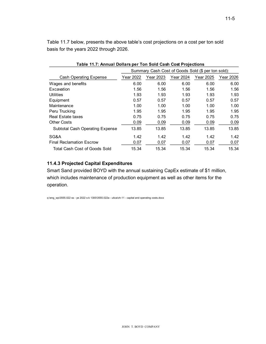 11-5 JOHN T. BOYD COMPANY Table 11.7 below, presents the above table’s cost projections on a cost per ton sold basis for the years 2022 through 2026. Summary Cash Cost of Goods Sold ($ per ton sold): Cash Operating Expense Year 2022 Year 2023 Year 2024 Year 2025 Year 2026 Wages and benefits 6.00 6.00 6.00 6.00 6.00 Excavation 1.56 1.56 1.56 1.56 1.56 Utilities 1.93 1.93 1.93 1.93 1.93 Equipment 0.57 0.57 0.57 0.57 0.57 Maintenance 1.00 1.00 1.00 1.00 1.00 Peru Trucking 1.95 1.95 1.95 1.95 1.95 Real Estate taxes 0.75 0.75 0.75 0.75 0.75 Other Costs 0.09 0.09 0.09 0.09 0.09 Subtotal Cash Operating Expense 13.85 13.85 13.85 13.85 13.85 SG&A 1.42 1.42 1.42 1.42 1.42 Final Reclamation Escrow 0.07 0.07 0.07 0.07 0.07 Total Cash Cost of Goods Sold 15.34 15.34 15.34 15.34 15.34 Table 11.7: Annual Dollars per Ton Sold Cash Cost Projections 11.4.3 Projected Capital Expenditures Smart Sand provided BOYD with the annual sustaining CapEx estimate of $1 million, which includes maintenance of production equipment as well as other items for the operation. q:\eng_wp\3555.022 ss - ye 2022 s-k 1300\3555.022a - utica\ch-11 - capital and operating costs.docx