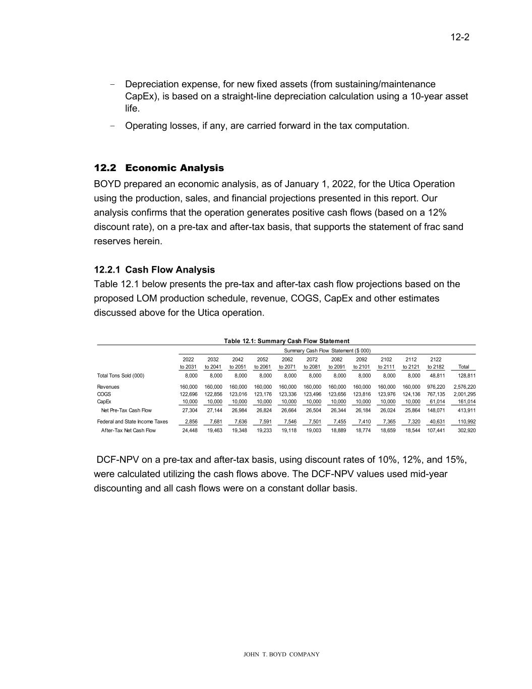 12-2 JOHN T. BOYD COMPANY − Depreciation expense, for new fixed assets (from sustaining/maintenance CapEx), is based on a straight-line depreciation calculation using a 10-year asset life. − Operating losses, if any, are carried forward in the tax computation. 12.2 Economic Analysis BOYD prepared an economic analysis, as of January 1, 2022, for the Utica Operation using the production, sales, and financial projections presented in this report. Our analysis confirms that the operation generates positive cash flows (based on a 12% discount rate), on a pre-tax and after-tax basis, that supports the statement of frac sand reserves herein. 12.2.1 Cash Flow Analysis Table 12.1 below presents the pre-tax and after-tax cash flow projections based on the proposed LOM production schedule, revenue, COGS, CapEx and other estimates discussed above for the Utica operation. Summary Cash Flow Statement ($ 000) 2022 2032 2042 2052 2062 2072 2082 2092 2102 2112 2122 to 2031 to 2041 to 2051 to 2061 to 2071 to 2081 to 2091 to 2101 to 2111 to 2121 to 2182 Total Total Tons Sold (000) 8,000 8,000 8,000 8,000 8,000 8,000 8,000 8,000 8,000 8,000 48,811 128,811 Revenues 160,000 160,000 160,000 160,000 160,000 160,000 160,000 160,000 160,000 160,000 976,220 2,576,220 COGS 122,696 122,856 123,016 123,176 123,336 123,496 123,656 123,816 123,976 124,136 767,135 2,001,295 CapEx 10,000 10,000 10,000 10,000 10,000 10,000 10,000 10,000 10,000 10,000 61,014 161,014 Net Pre-Tax Cash Flow 27,304 27,144 26,984 26,824 26,664 26,504 26,344 26,184 26,024 25,864 148,071 413,911 Federal and State Income Taxes 2,856 7,681 7,636 7,591 7,546 7,501 7,455 7,410 7,365 7,320 40,631 110,992 After-Tax Net Cash Flow 24,448 19,463 19,348 19,233 19,118 19,003 18,889 18,774 18,659 18,544 107,441 302,920 Table 12.1: Summary Cash Flow Statement DCF-NPV on a pre-tax and after-tax basis, using discount rates of 10%, 12%, and 15%, were calculated utilizing the cash flows above. The DCF-NPV values used mid-year discounting and all cash flows were on a constant dollar basis.