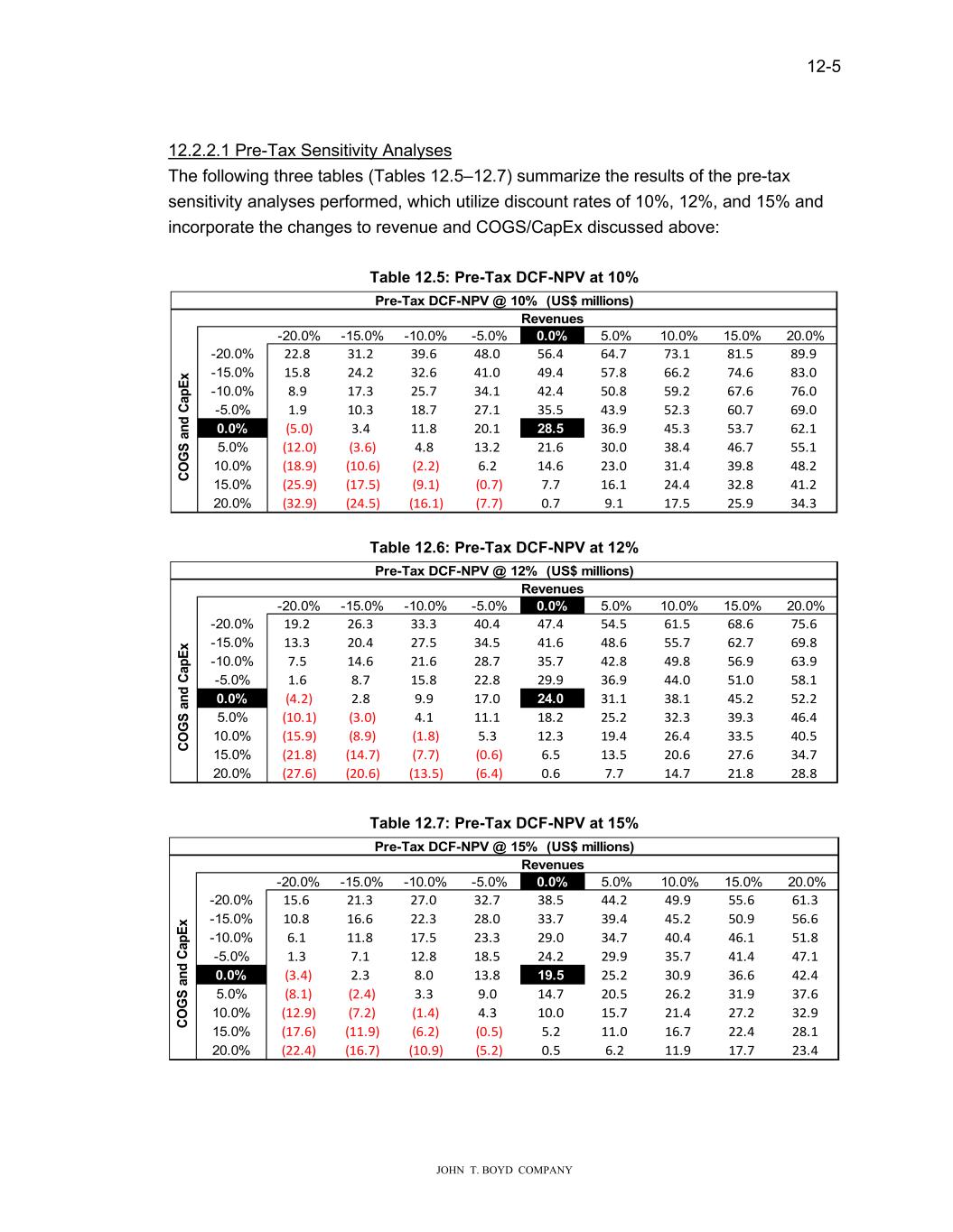 12-5 JOHN T. BOYD COMPANY 12.2.2.1 Pre-Tax Sensitivity Analyses The following three tables (Tables 12.5–12.7) summarize the results of the pre-tax sensitivity analyses performed, which utilize discount rates of 10%, 12%, and 15% and incorporate the changes to revenue and COGS/CapEx discussed above: Table 12.5: Pre-Tax DCF-NPV at 10% Pre-Tax DCF-NPV @ 10% (US$ millions) -20.0% -15.0% -10.0% -5.0% 0.0% 5.0% 10.0% 15.0% 20.0% -20.0% 22.8 31.2 39.6 48.0 56.4 64.7 73.1 81.5 89.9 -15.0% 15.8 24.2 32.6 41.0 49.4 57.8 66.2 74.6 83.0 -10.0% 8.9 17.3 25.7 34.1 42.4 50.8 59.2 67.6 76.0 -5.0% 1.9 10.3 18.7 27.1 35.5 43.9 52.3 60.7 69.0 0.0% (5.0) 3.4 11.8 20.1 28.5 36.9 45.3 53.7 62.1 5.0% (12.0) (3.6) 4.8 13.2 21.6 30.0 38.4 46.7 55.1 10.0% (18.9) (10.6) (2.2) 6.2 14.6 23.0 31.4 39.8 48.2 15.0% (25.9) (17.5) (9.1) (0.7) 7.7 16.1 24.4 32.8 41.2 20.0% (32.9) (24.5) (16.1) (7.7) 0.7 9.1 17.5 25.9 34.3 CO G S an d Ca pE x Revenues Table 12.6: Pre-Tax DCF-NPV at 12% Pre-Tax DCF-NPV @ 12% (US$ millions) -20.0% -15.0% -10.0% -5.0% 0.0% 5.0% 10.0% 15.0% 20.0% -20.0% 19.2 26.3 33.3 40.4 47.4 54.5 61.5 68.6 75.6 -15.0% 13.3 20.4 27.5 34.5 41.6 48.6 55.7 62.7 69.8 -10.0% 7.5 14.6 21.6 28.7 35.7 42.8 49.8 56.9 63.9 -5.0% 1.6 8.7 15.8 22.8 29.9 36.9 44.0 51.0 58.1 0.0% (4.2) 2.8 9.9 17.0 24.0 31.1 38.1 45.2 52.2 5.0% (10.1) (3.0) 4.1 11.1 18.2 25.2 32.3 39.3 46.4 10.0% (15.9) (8.9) (1.8) 5.3 12.3 19.4 26.4 33.5 40.5 15.0% (21.8) (14.7) (7.7) (0.6) 6.5 13.5 20.6 27.6 34.7 20.0% (27.6) (20.6) (13.5) (6.4) 0.6 7.7 14.7 21.8 28.8 Revenues CO G S an d Ca pE x Table 12.7: Pre-Tax DCF-NPV at 15% Pre-Tax DCF-NPV @ 15% (US$ millions) -20.0% -15.0% -10.0% -5.0% 0.0% 5.0% 10.0% 15.0% 20.0% -20.0% 15.6 21.3 27.0 32.7 38.5 44.2 49.9 55.6 61.3 -15.0% 10.8 16.6 22.3 28.0 33.7 39.4 45.2 50.9 56.6 -10.0% 6.1 11.8 17.5 23.3 29.0 34.7 40.4 46.1 51.8 -5.0% 1.3 7.1 12.8 18.5 24.2 29.9 35.7 41.4 47.1 0.0% (3.4) 2.3 8.0 13.8 19.5 25.2 30.9 36.6 42.4 5.0% (8.1) (2.4) 3.3 9.0 14.7 20.5 26.2 31.9 37.6 10.0% (12.9) (7.2) (1.4) 4.3 10.0 15.7 21.4 27.2 32.9 15.0% (17.6) (11.9) (6.2) (0.5) 5.2 11.0 16.7 22.4 28.1 20.0% (22.4) (16.7) (10.9) (5.2) 0.5 6.2 11.9 17.7 23.4 Revenues CO G S an d Ca pE x
