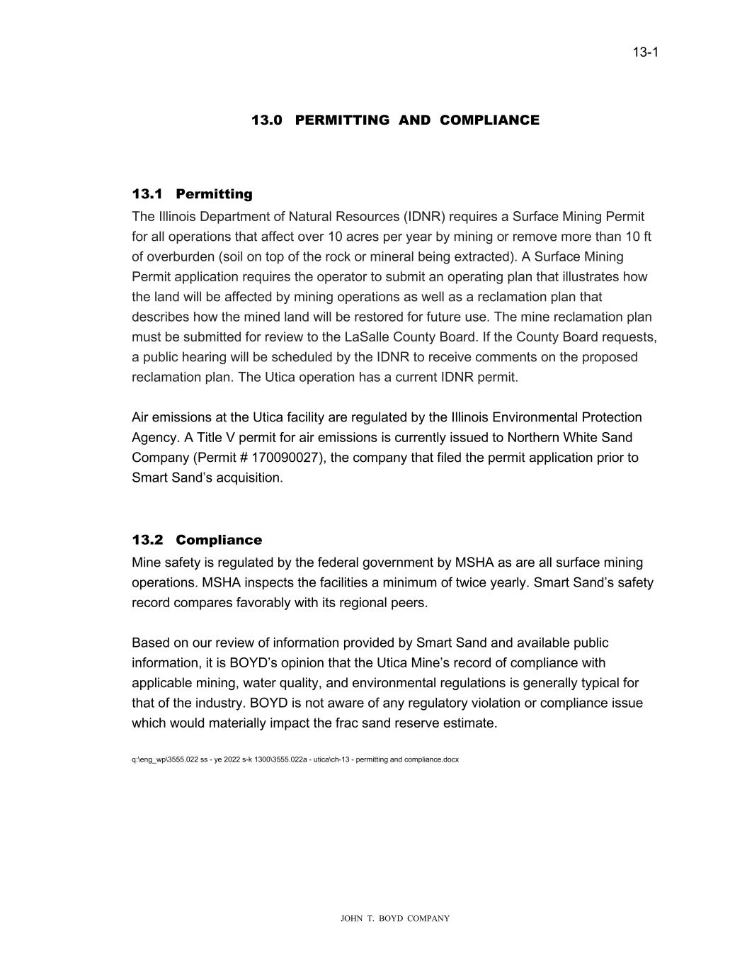 13-1 JOHN T. BOYD COMPANY 13.0 PERMITTING AND COMPLIANCE 13.1 Permitting The Illinois Department of Natural Resources (IDNR) requires a Surface Mining Permit for all operations that affect over 10 acres per year by mining or remove more than 10 ft of overburden (soil on top of the rock or mineral being extracted). A Surface Mining Permit application requires the operator to submit an operating plan that illustrates how the land will be affected by mining operations as well as a reclamation plan that describes how the mined land will be restored for future use. The mine reclamation plan must be submitted for review to the LaSalle County Board. If the County Board requests, a public hearing will be scheduled by the IDNR to receive comments on the proposed reclamation plan. The Utica operation has a current IDNR permit. Air emissions at the Utica facility are regulated by the Illinois Environmental Protection Agency. A Title V permit for air emissions is currently issued to Northern White Sand Company (Permit # 170090027), the company that filed the permit application prior to Smart Sand’s acquisition. 13.2 Compliance Mine safety is regulated by the federal government by MSHA as are all surface mining operations. MSHA inspects the facilities a minimum of twice yearly. Smart Sand’s safety record compares favorably with its regional peers. Based on our review of information provided by Smart Sand and available public information, it is BOYD’s opinion that the Utica Mine’s record of compliance with applicable mining, water quality, and environmental regulations is generally typical for that of the industry. BOYD is not aware of any regulatory violation or compliance issue which would materially impact the frac sand reserve estimate. q:\eng_wp\3555.022 ss - ye 2022 s-k 1300\3555.022a - utica\ch-13 - permitting and compliance.docx
