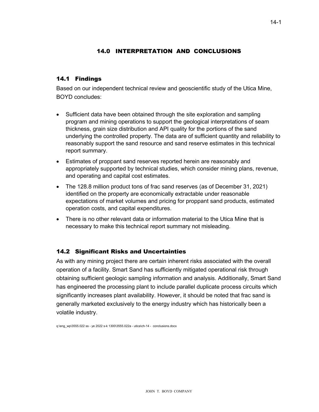 14-1 JOHN T. BOYD COMPANY 14.0 INTERPRETATION AND CONCLUSIONS 14.1 Findings Based on our independent technical review and geoscientific study of the Utica Mine, BOYD concludes: • Sufficient data have been obtained through the site exploration and sampling program and mining operations to support the geological interpretations of seam thickness, grain size distribution and API quality for the portions of the sand underlying the controlled property. The data are of sufficient quantity and reliability to reasonably support the sand resource and sand reserve estimates in this technical report summary. • Estimates of proppant sand reserves reported herein are reasonably and appropriately supported by technical studies, which consider mining plans, revenue, and operating and capital cost estimates. • The 128.8 million product tons of frac sand reserves (as of December 31, 2021) identified on the property are economically extractable under reasonable expectations of market volumes and pricing for proppant sand products, estimated operation costs, and capital expenditures. • There is no other relevant data or information material to the Utica Mine that is necessary to make this technical report summary not misleading. 14.2 Significant Risks and Uncertainties As with any mining project there are certain inherent risks associated with the overall operation of a facility. Smart Sand has sufficiently mitigated operational risk through obtaining sufficient geologic sampling information and analysis. Additionally, Smart Sand has engineered the processing plant to include parallel duplicate process circuits which significantly increases plant availability. However, it should be noted that frac sand is generally marketed exclusively to the energy industry which has historically been a volatile industry. q:\eng_wp\3555.022 ss - ye 2022 s-k 1300\3555.022a - utica\ch-14 - conclusions.docx