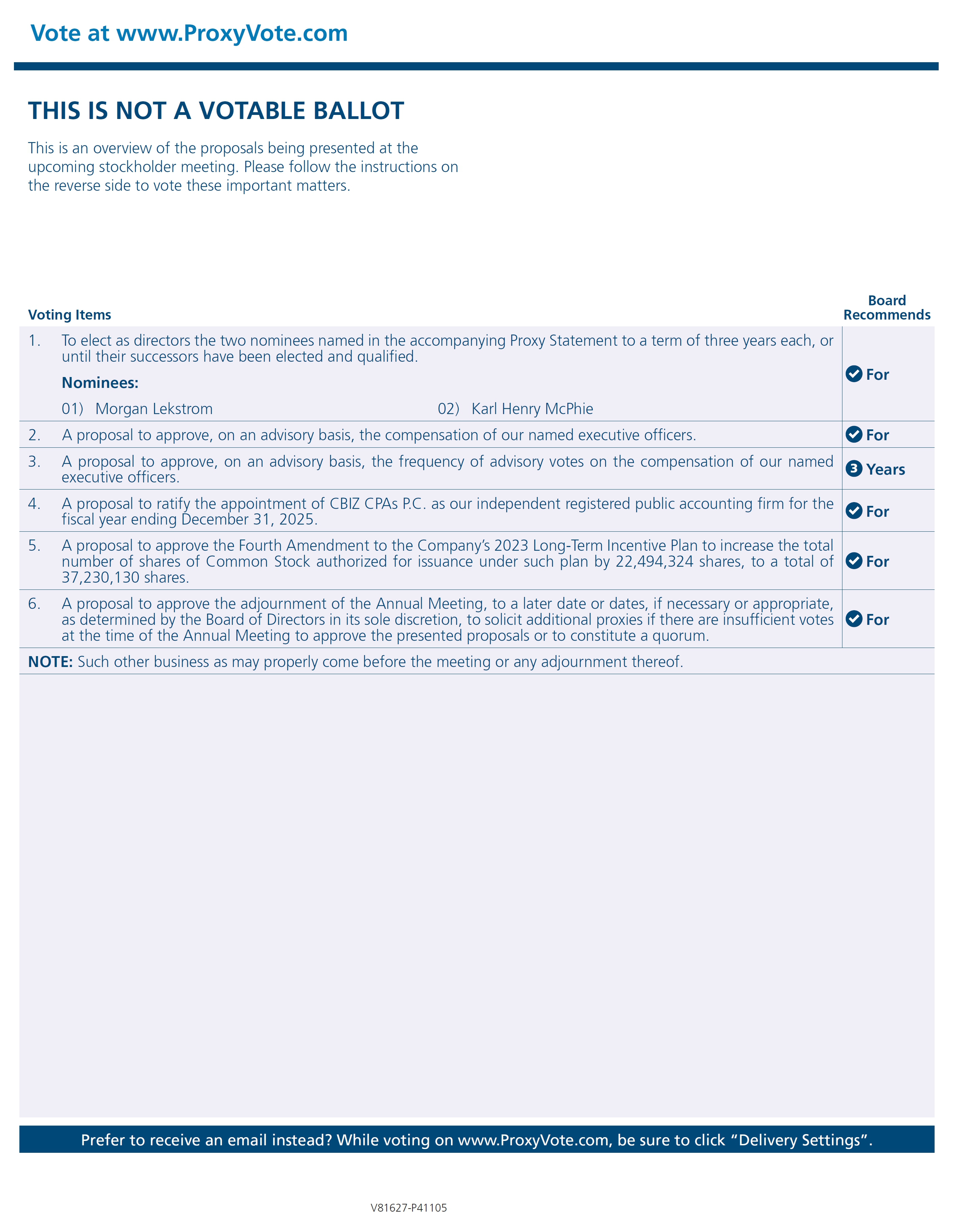 We are distributing our proxy materials to certain stockholders via the Internet under the U.S. Securities and Exchange Commission “Notice and Access” rules. We believe this approach allows us to provide stockholders with a timely and convenient way to receive proxy materials and vote, while lowering the costs of delivery and reducing the environmental impact of our Annual Meeting. We are mailing to our stockholders a Notice of Internet Availability of Proxy Materials (the “Notice of Internet Availability”) beginning on or about November 20, 2025, rather than a paper copy of the proxy statement, the proxy card and our 2024 Annual Report, which includes our annual report on Form 10-K for the fiscal year ended December 31, 2024. The Notice of Internet Availability contains instructions on how to access the proxy materials, vote and obtain, if desired, a paper copy of the proxy materials.