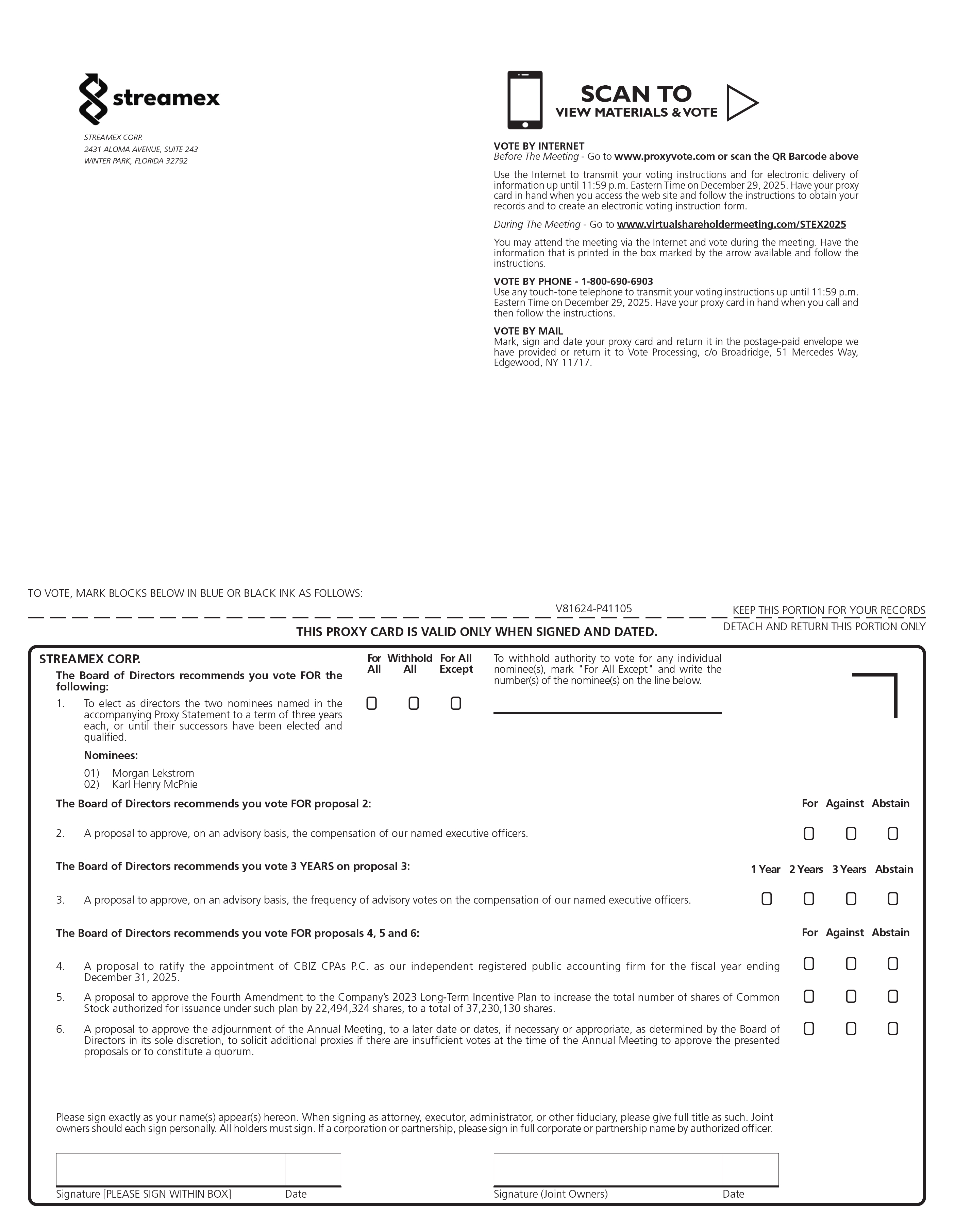 The 2025 Annual Meeting of Stockholders (the “Annual Meeting”) of Streamex Corp., a Delaware corporation (the “Company”), will be held on December 30, 2025, at 3:00 p.m. Eastern Time by means of a live virtual-only online webcast at www.virtualshareholdermeeting.com/STEX2025. We will consider and act on the following items of business at the Annual Meeting: