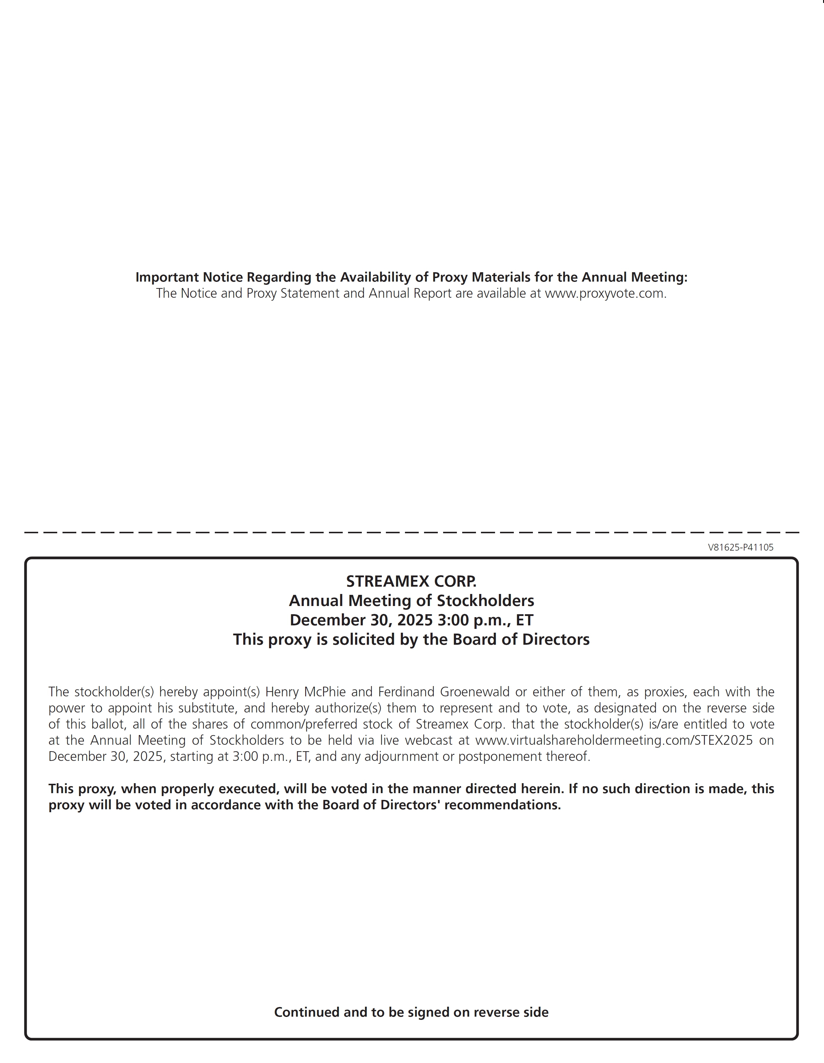 You are cordially invited to attend the 2025 Annual Meeting of Stockholders (the “Annual Meeting”) of Streamex Corp. to be virtually held at 3:00 p.m., Eastern Time, on December 30, 2025.