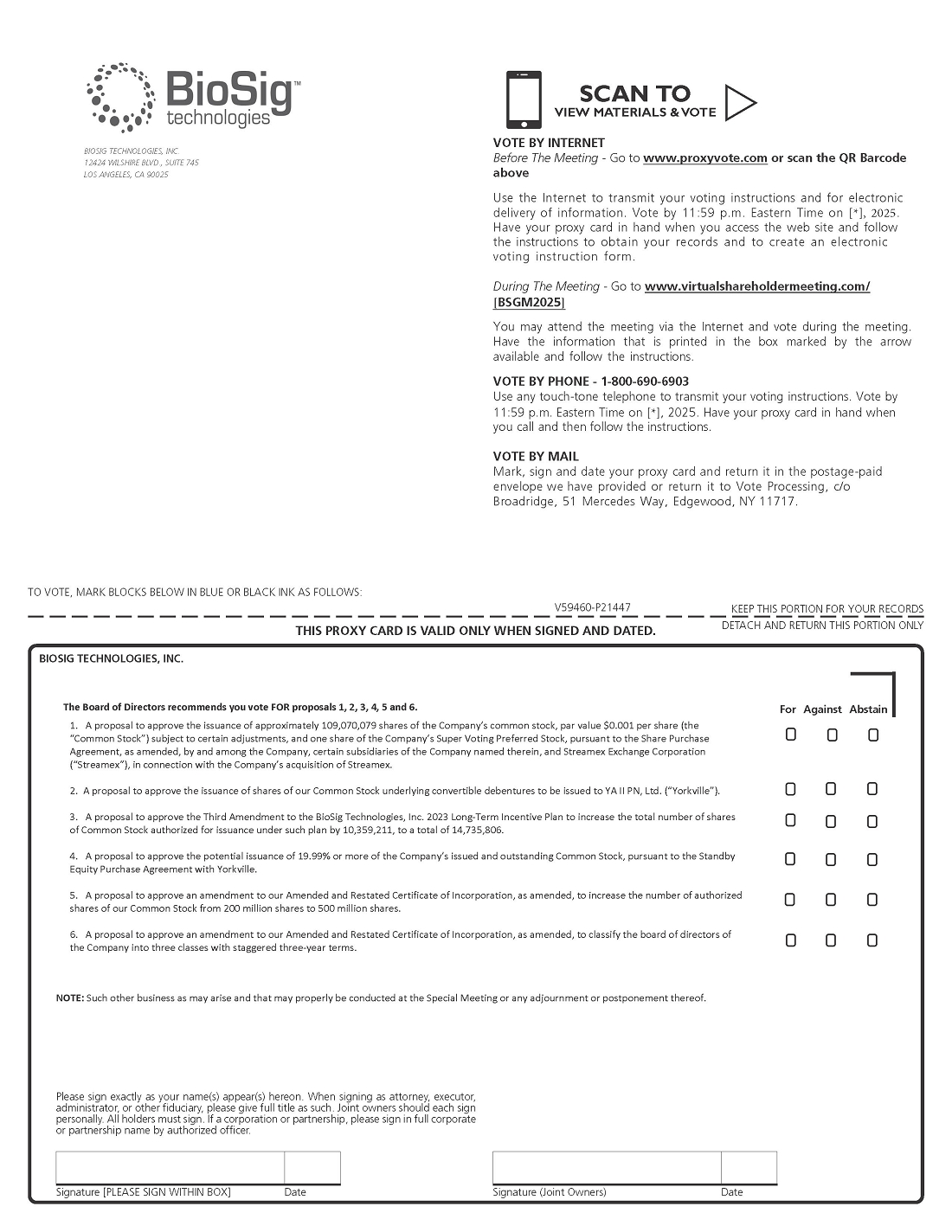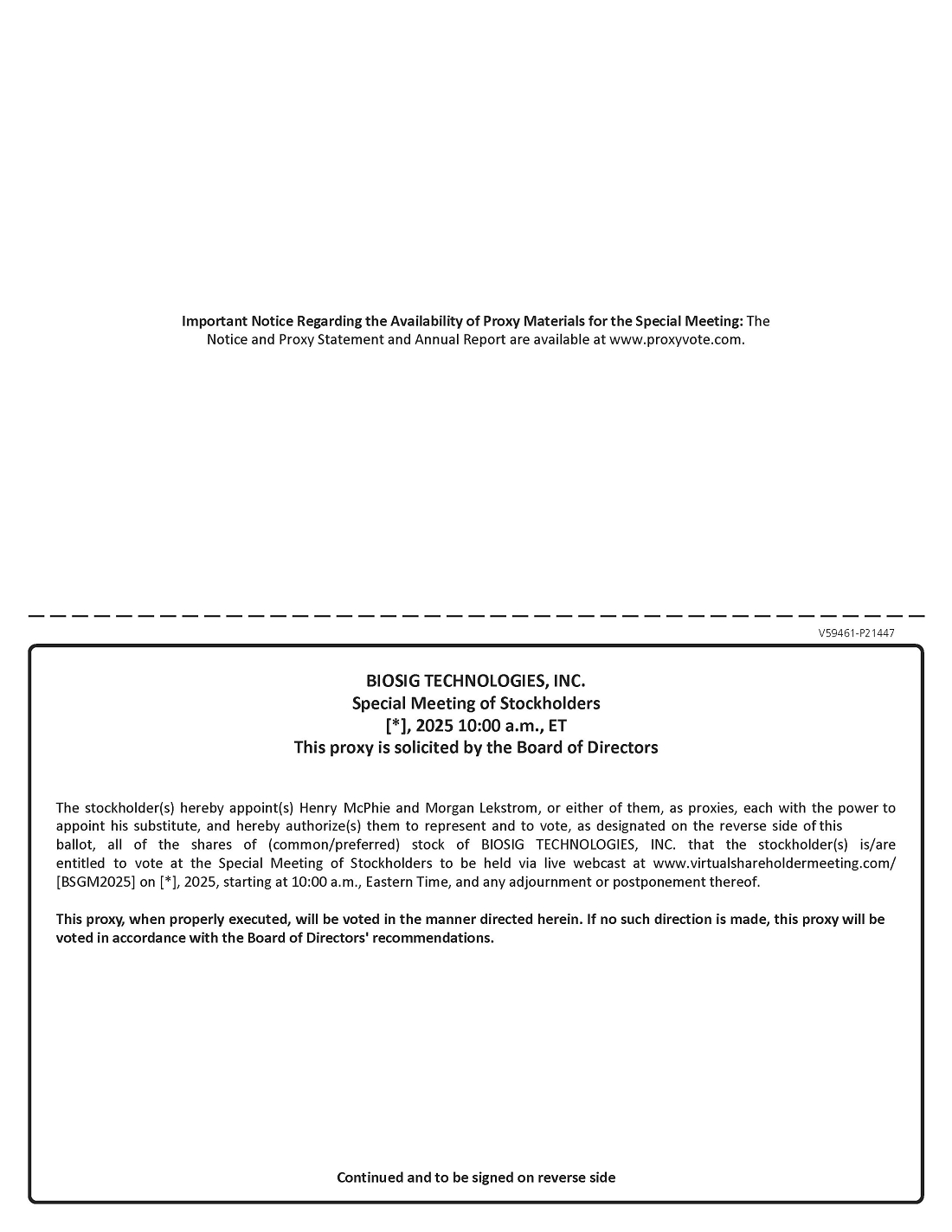 You are cordially invited to attend the Special Meeting of Stockholders (the “Special Meeting”) of BioSig Technologies, Inc. to be virtually held at 10:00 a.m., Eastern Time, on [ ], 2025.