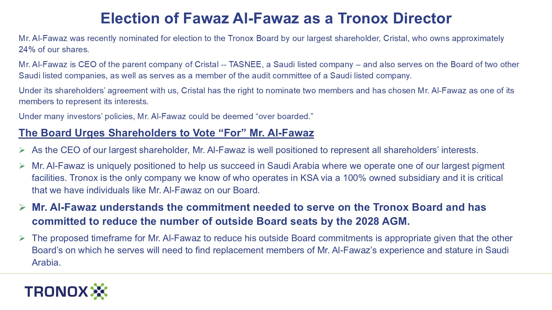 a 100% owned subsidiary and it is critical that we have individuals like Mr. Al-Fawaz on our Board. Mr. Al-Fawaz understands the commitment needed to serve on the Tronox Board and has committed to reduce the number of outside Board seats by