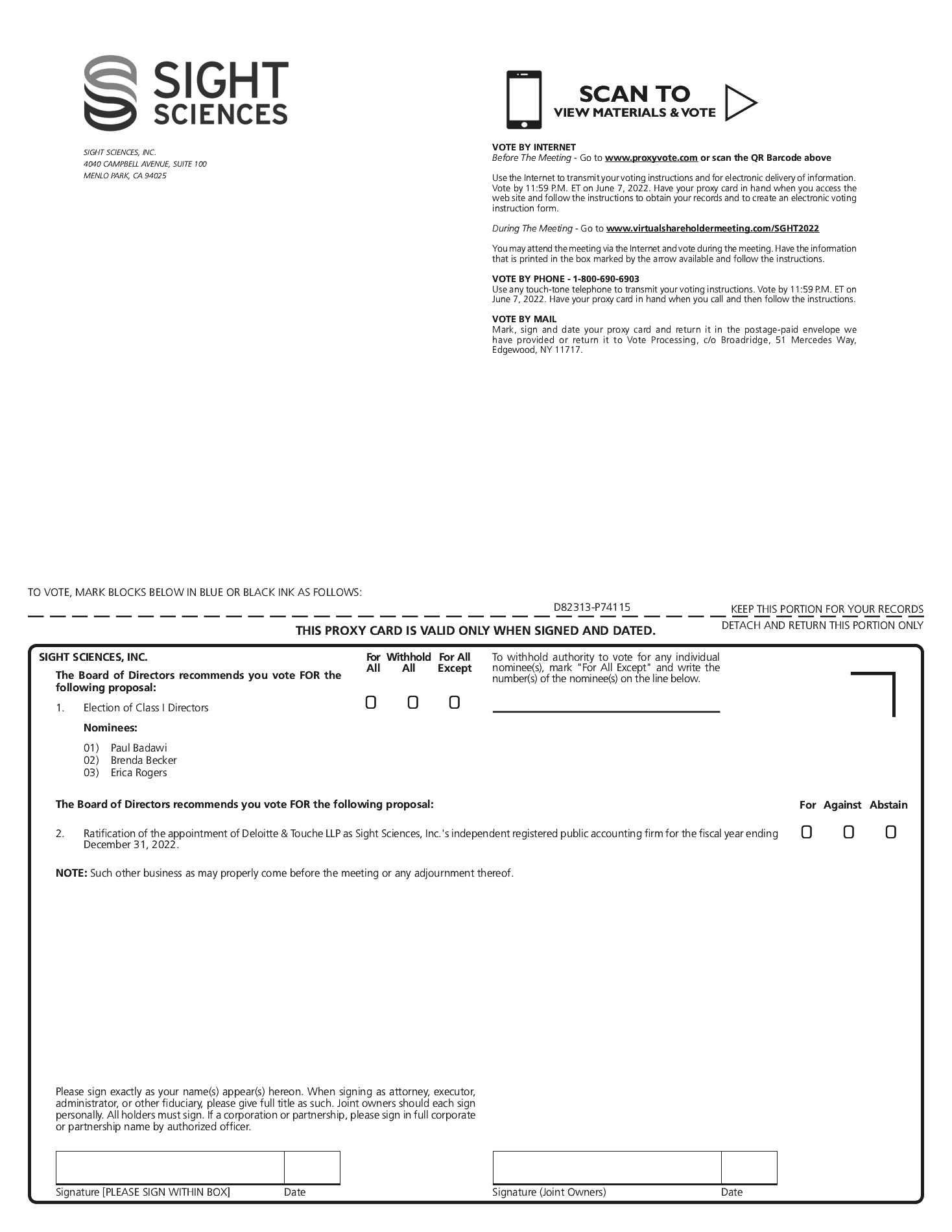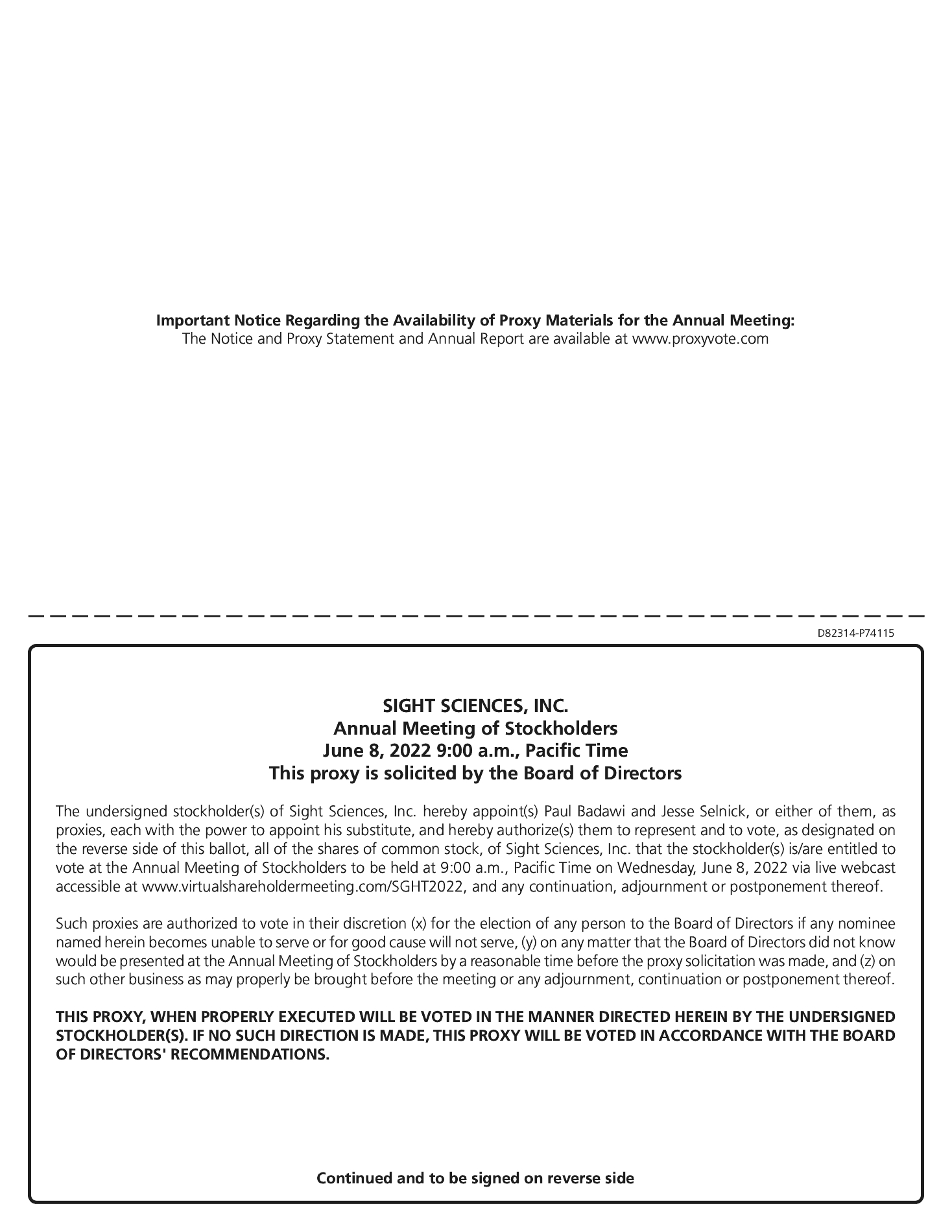 You may attend the Annual Meeting online only if you are an Sight Sciences stockholder who is entitled to vote at the Annual Meeting, or if you hold a valid proxy for the Annual Meeting. You may attend and participate in the Annual Meeting by visiting the following website: www.virtualshareholdermeeting.com/SGHT2022. To attend and participate in the Annual Meeting, you will need the 16-digit control number included in your Internet Notice, on your proxy card or on the instructions that accompanied your proxy materials. If your shares are held in “street name,” you should contact your bank or broker to obtain your 16-digit control number or otherwise vote through the bank or broker. If you lose your 16-digit control number, you may join the Annual Meeting as a “Guest” but you will not be able to vote, ask questions or access the list of stockholders as of the Record Date. The meeting webcast will begin promptly at 9:00 a.m. Pacific time. We encourage you to access the meeting prior to the start time. Online check-in will begin at 9:00 a.m. Pacific] time, and you should allow ample time for the check-in procedures.