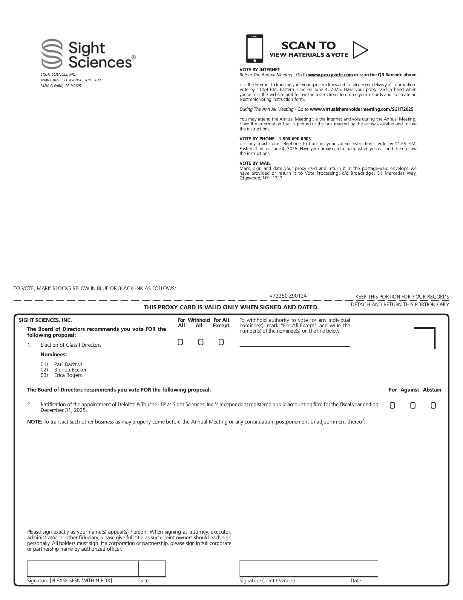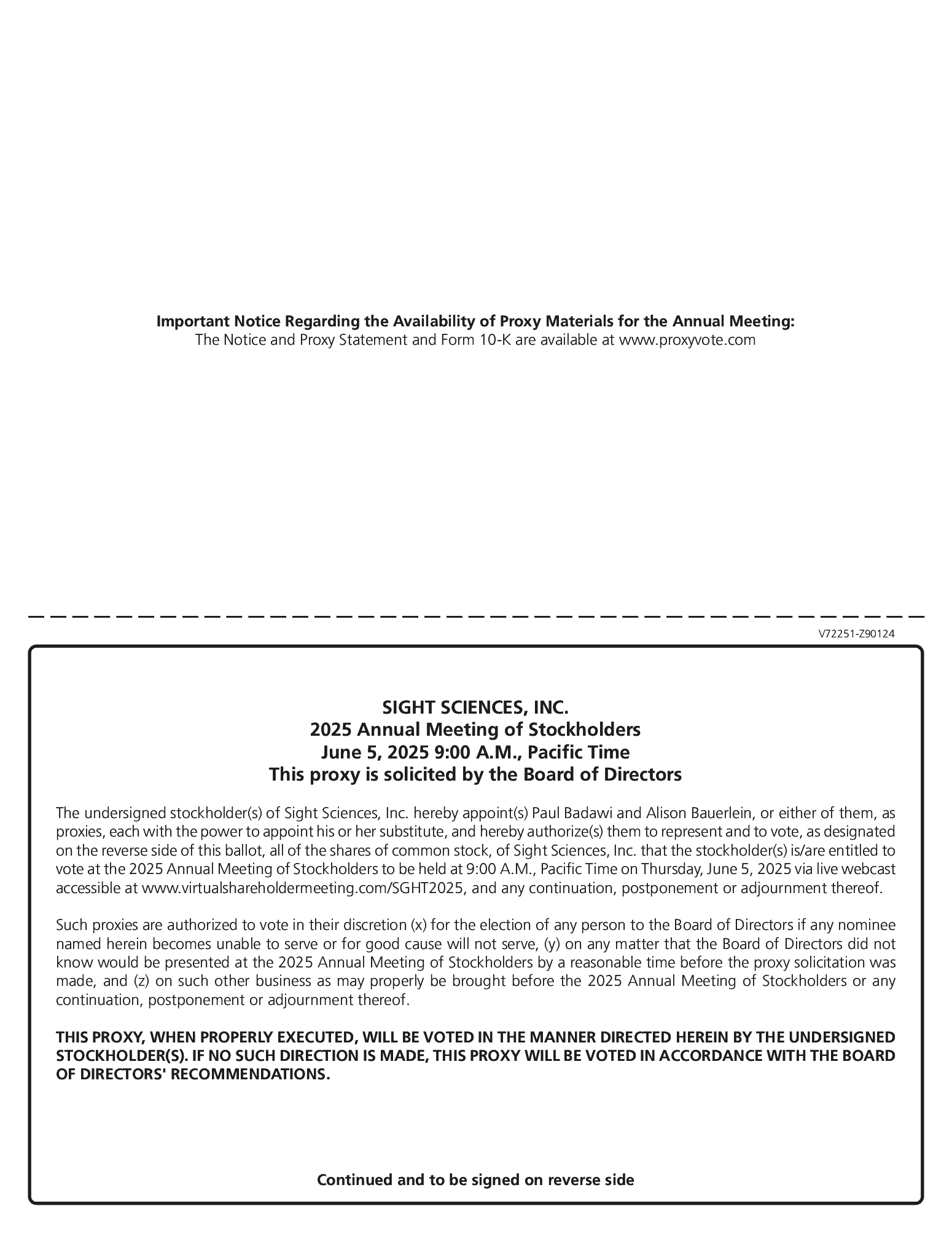 Communications are forwarded to all directors if they relate to important substantive matters and include suggestions or comments that our Corporate Secretary and Chairperson of the Board consider to be important for the directors to know. In general, communications relating to corporate governance and long-term corporate strategy are more likely to be forwarded than communications relating to ordinary business affairs, personal grievances and matters as to which we tend to receive repetitive or duplicative communications. Stockholders who wish to send communications on any topic to the Board should address such communications to the Board in writing: c/o Corporate Secretary, Sight Sciences, Inc., 4040 Campbell Ave, Suite 100, Menlo Park, California 94025.