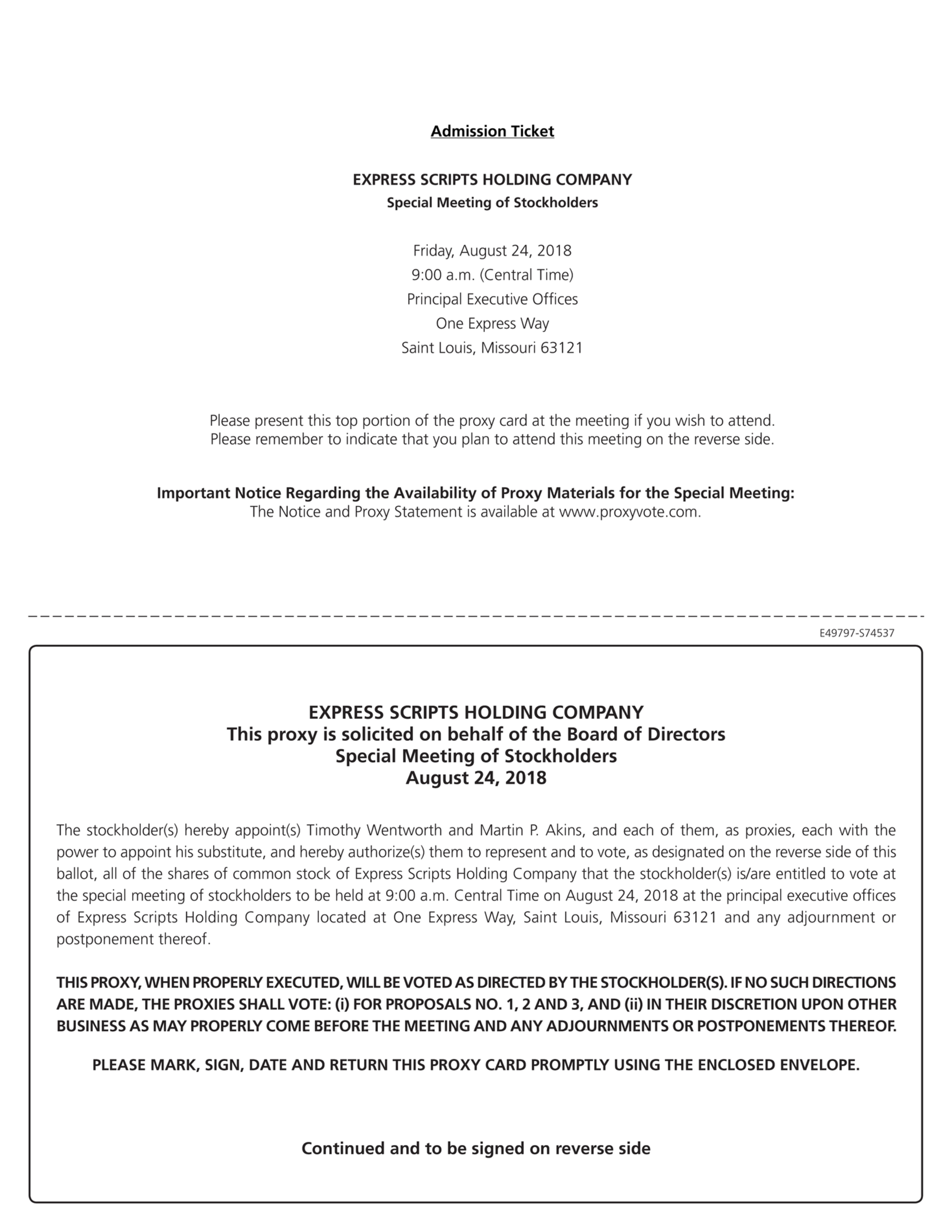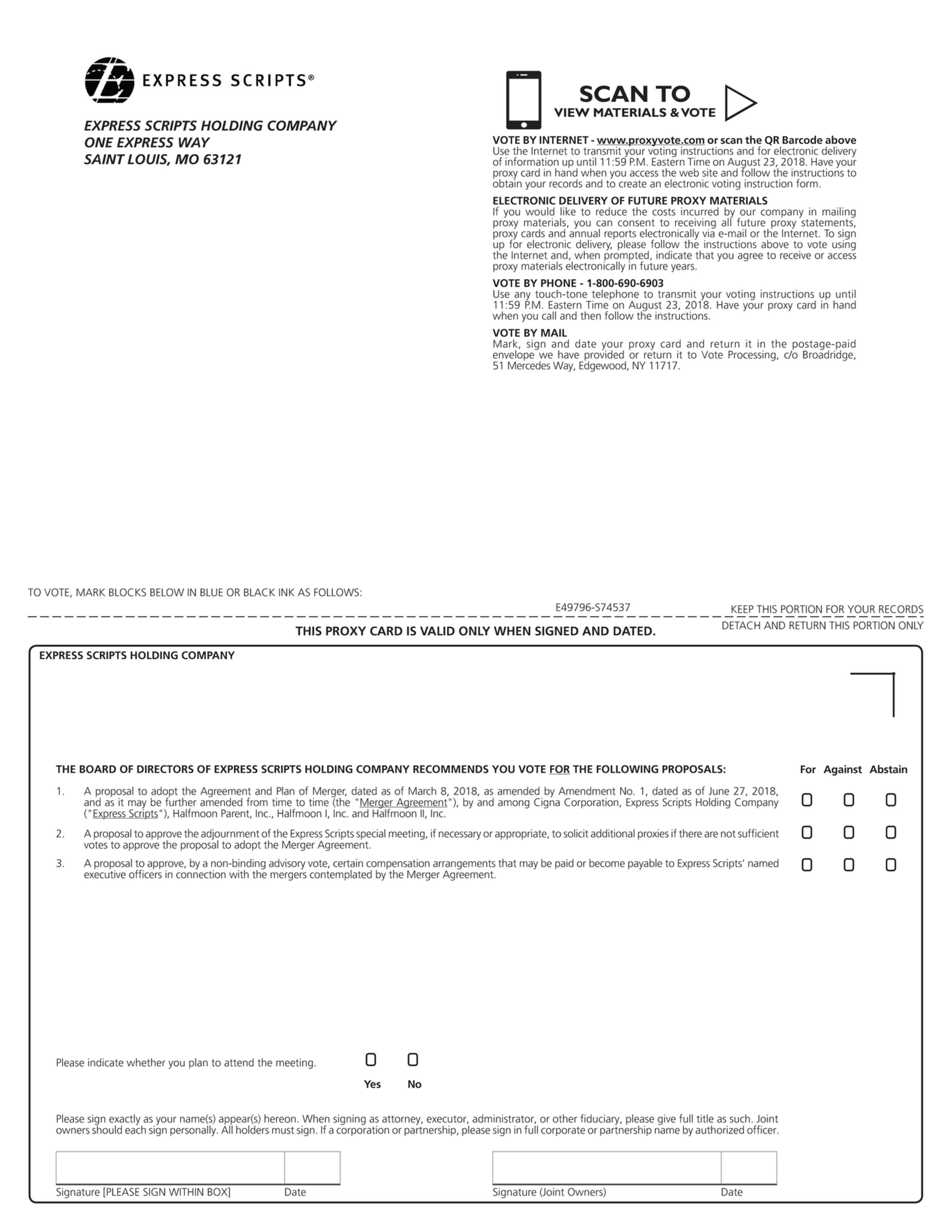 | 1. | To consider and vote on a proposal to adopt the Agreement and Plan of Merger, dated as of March 8, 2018, as amended by Amendment No. 1, dated as of June 27, 2018, and as it may be further amended from time to time, which agreement we refer to as the merger agreement, by and among Cigna Corporation, which we refer to as Cigna, Express Scripts Holding Company, Halfmoon Parent, Inc., Halfmoon I, Inc. and Halfmoon II, Inc.; and |