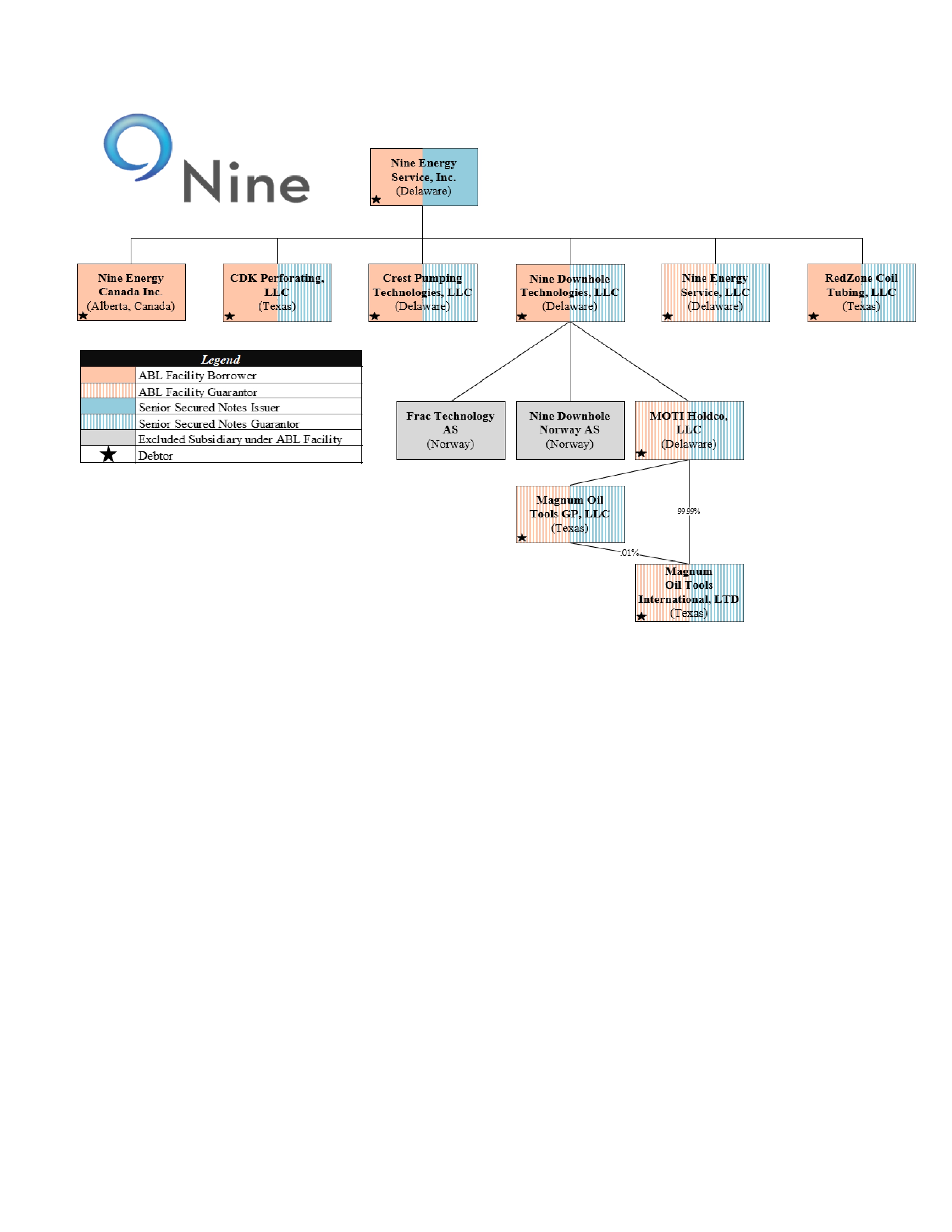 | 1 | A complete list of each of the Debtors in these Chapter 11 Cases may be obtained on the website of the Debtors’ claims and noticing agent at https://dm.epiq11.com/NineEnergy. The location of Nine Energy Service, Inc.’s principal place of business and the Debtors’ service address in these Chapter 11 Cases is 2001 Kirby Drive, Suite 200, Houston, TX 77019. |