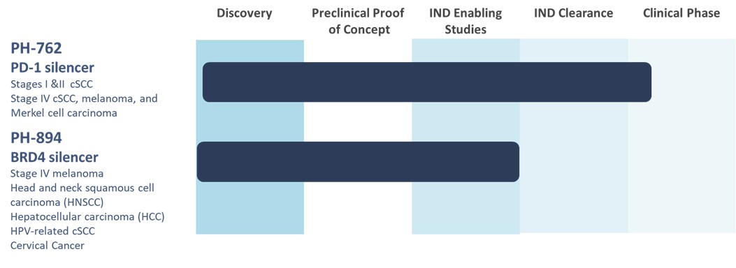 PH-762 is an INTASYL compound designed to reduce the expression of cell death protein 1 (“PD-1”). PH-762 is currently being evaluated in a U.S. multi-center Phase 1b dose-escalating clinical trial through the intratumoral injection of PH-762 for the treatment of patients with cutaneous squamous cell carcinoma, melanoma and Merkel cell carcinoma. The trial (NCT 06014086) is designed to evaluate the safety and tolerability of neoadjuvant use of intratumorally injected PH-762, assess the tumor response, and determine the dose or dose range for continued study of PH-762 and is expected to enroll up to 30 patients. In May and December 2024, respectively, a Safety Monitoring Committee (SMC) reviewed data from the first and second dose cohorts treated with PH-762, and in both instances recommended escalation to the next dose concentration. A total of 7 patients with cutaneous carcinomas have been enrolled in dose cohorts 1 and 2. The second cohort enrolled a total of 4 patients who were diagnosed with cutaneous squamous cell carcinoma. At Day 36 (tumor excision), while patients in the first cohort had stable disease, a complete response (100% tumor clearance) was reported for 2 patients with cutaneous squamous cell carcinoma. Partial response (90% tumor clearance) was reported for 1 patient with cutaneous squamous cell carcinoma and 1 patient had stable disease, having not progressed. In this trial to date, intratumoral injection of PH-762 has been well tolerated in all enrolled patients and there were no dose-limiting toxicities or clinically relevant treatment-emergent adverse effects in the patients receiving intratumoral PH-762. The third dose cohort is fully enrolled and patients in this cohort are currently in the treatment or follow-up phase of the study. We expect to complete enrollment of all patients in the study in the third quarter of 2025.