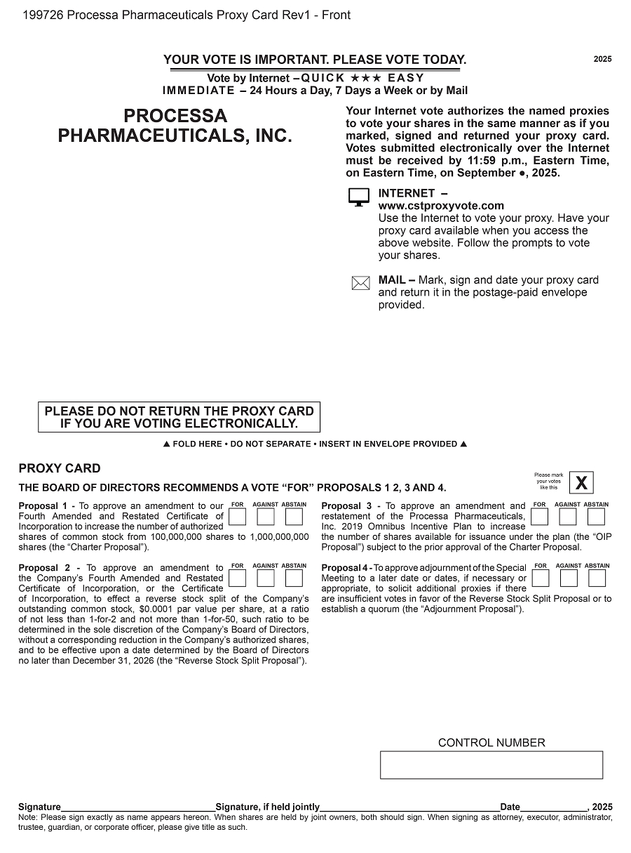 NOTICE HEREBY IS GIVEN that a Special Meeting of Stockholders of Processa Pharmaceuticals, Inc. will be held at 601 21st Street, Suite 300, Vero Beach, FL, 32960, on ●, 2025, beginning at 1:00 pm, Eastern Time for the following purposes: