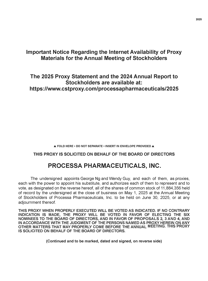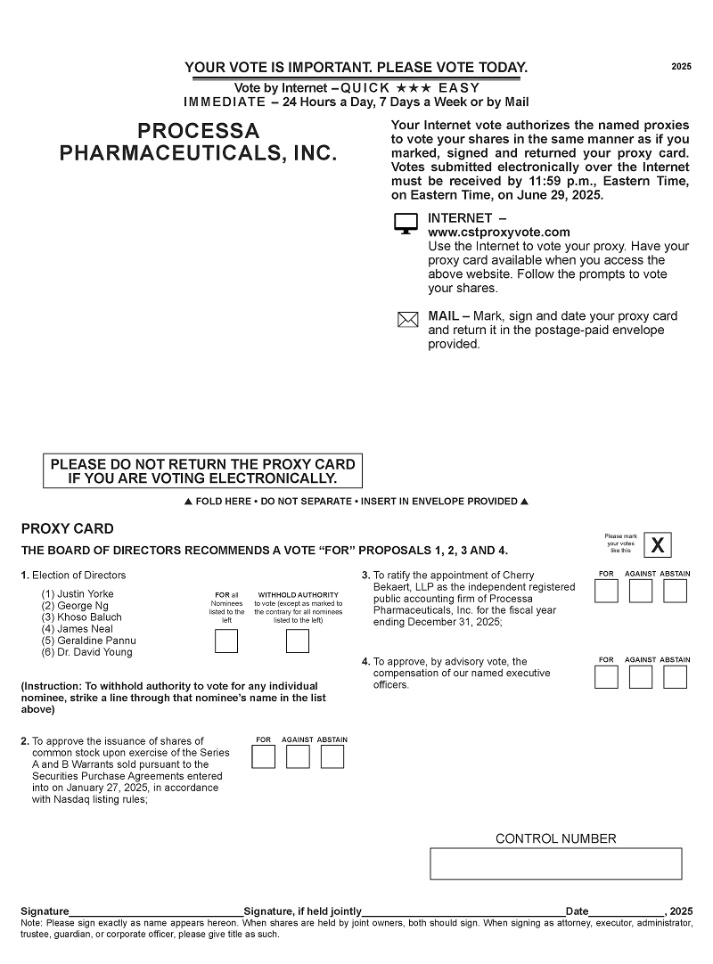 NOTICE HEREBY IS GIVEN that the 2025 Annual Meeting of Stockholders of Processa Pharmaceuticals, Inc. will be held at our corporate office located at 7380 Coca Cola Drive, Suite 106, Hanover, MD 21076 on Monday, June 30, 2025, beginning at 1:00 p.m., Eastern Time. The Annual Meeting will be held for the following purposes: