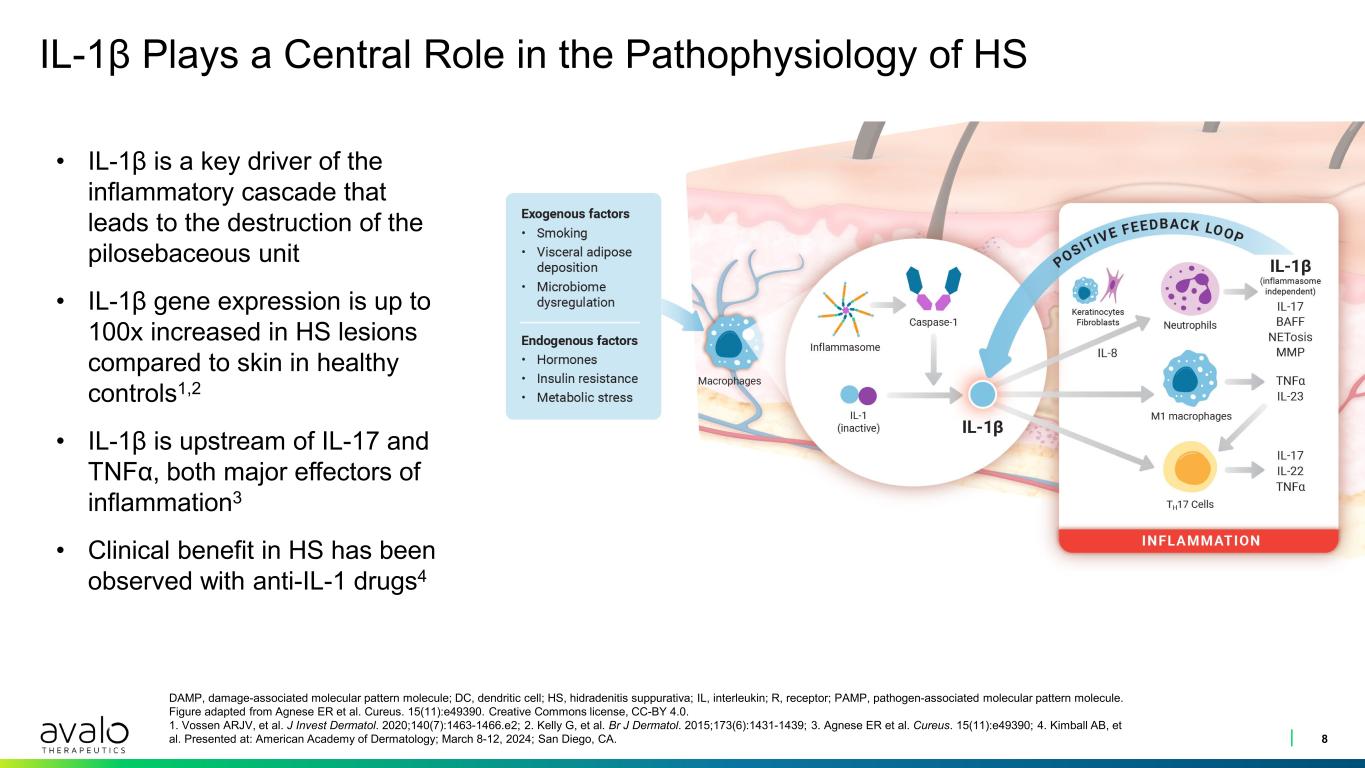 Persistent Unmet Need in HS Due to Limited Efficacy of Current Anti- TNF and Anti-IL-17 Biologic Therapies 7 HS, hidradenitis suppurativa. aCurrent treatments include antibiotics, retinoids, steroids, Cosentyx®, Humira®. 1. Ingram JR, et al. J Eur Acad Dermatol Venereol. 2022;36(9):1597-1605; 2. Kimball AB, et al. Dermatol Ther (Heidelb). 2024;14(1):83-98. 0% 10% 20% 30% 40% 50% 60% 70% 80% 90% General pain/discomfort Restricted/painful movement Pain on sitting Malodorous drainage Low mood/depression Mild HS (n = 1179) Moderate HS (n = 523) Severe HS (n = 85) Severe Impact on Quality of Life A large proportion of patients still report significant and life-disrupting symptoms with existing treatment options1,2,a Pr op or tio n of p at ie nt s re po rti ng a sy m pt om