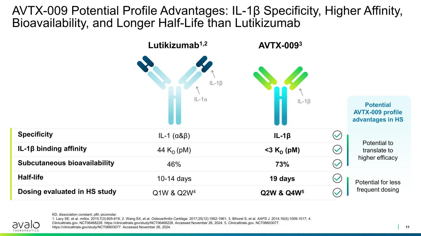 AVTX-009 Is A Highly Potent, Specific Inhibitor of IL-1β • Clinical experience – 245 patients studied in phase 1 and phase 2 trials2,3-6 – Significant and rapid lowering of inflammatory biomarkers after a single dose of 0.6 mg – Well-tolerated and favorable safety profile at all doses up to 180 mg SC weekly • Stable 150 mg/mL SC dosage formulation3 • Potency and half-life expected to support up to Q4W dosing in hidradenitis suppurativa and potentially a longer dosing interval in other indications 10 IL, interleukin; IV, intravenous; KD, dissociation constant; Q4W, every 4 weeks; SC, subcutaneous. 1. Bihorel S, et al. AAPS J. 2014;16(5):1009-1017; 2. Sloan-Lancaster J, et al. Diabetes Care. 2013;36(8):2239-2246; 3. Data on file; 4. NCT04983732. Clinicaltrials.gov. Accessed September 5, 2024. https://clinicaltrials.gov/study/NCT04983732; 5. NCT00942188. Clinicaltrials.gov. Accessed September 5, 2024. https://clinicaltrials.gov/study/NCT00942188; 6. NCT00380744. Clinicaltrials.gov. Accessed September 5, 2024. https://clinicaltrials.gov/study/NCT00380744. AVTX-0091 IL-1β