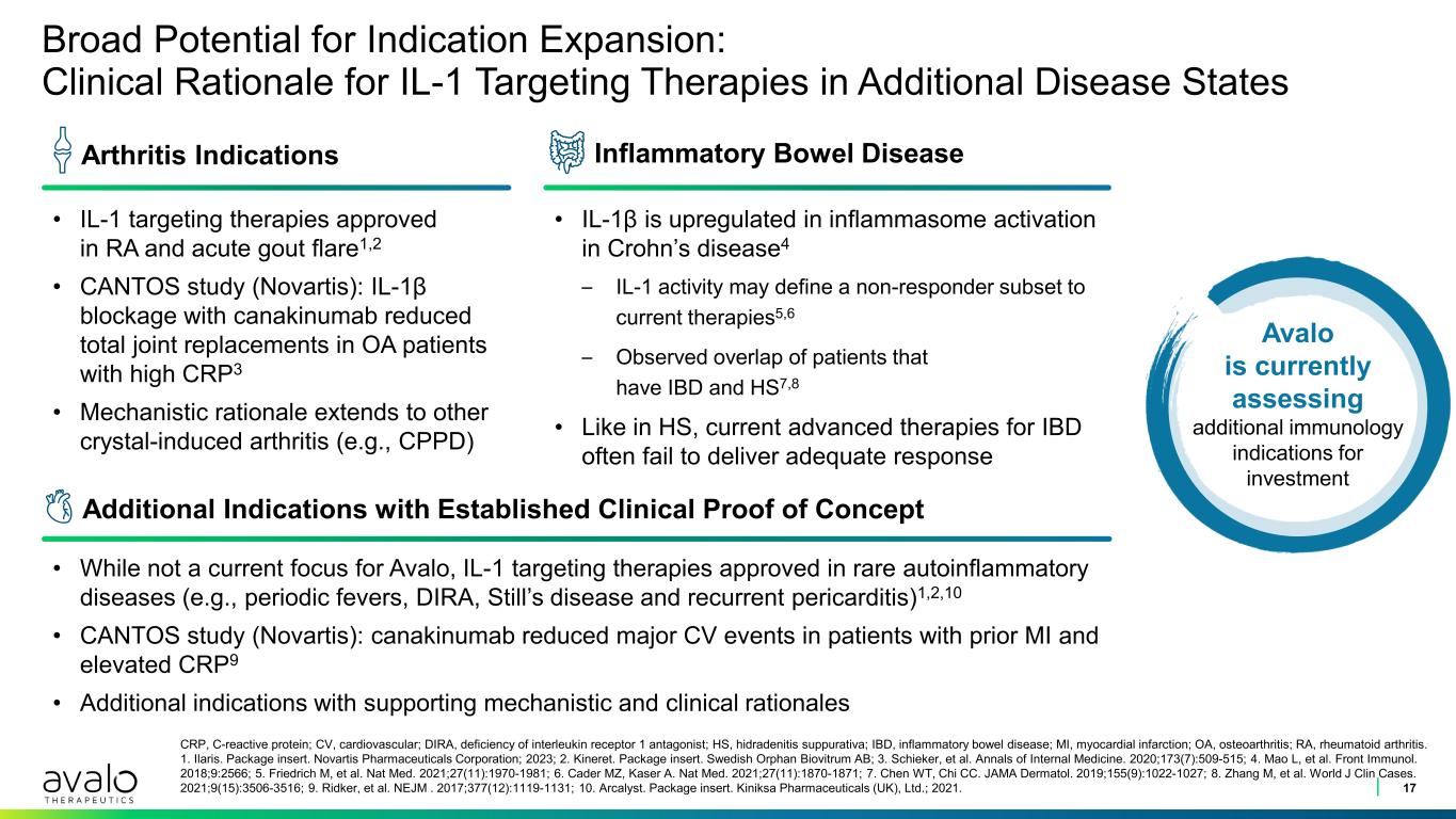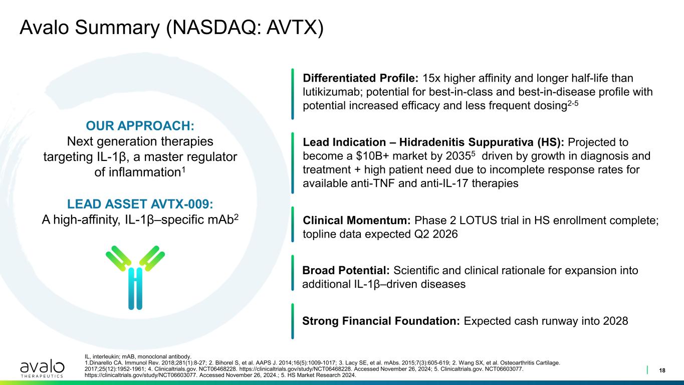 Broad Potential for Indication Expansion: Clinical Rationale for IL-1 Targeting Therapies in Additional Disease States 17 CRP, C-reactive protein; CV, cardiovascular; DIRA, deficiency of interleukin receptor 1 antagonist; HS, hidradenitis suppurativa; IBD, inflammatory bowel disease; MI, myocardial infarction; OA, osteoarthritis; RA, rheumatoid arthritis. 1. Ilaris. Package insert. Novartis Pharmaceuticals Corporation; 2023; 2. Kineret. Package insert. Swedish Orphan Biovitrum AB; 3. Schieker, et al. Annals of Internal Medicine. 2020;173(7):509-515; 4. Mao L, et al. Front Immunol. 2018;9:2566; 5. Friedrich M, et al. Nat Med. 2021;27(11):1970-1981; 6. Cader MZ, Kaser A. Nat Med. 2021;27(11):1870-1871; 7. Chen WT, Chi CC. JAMA Dermatol. 2019;155(9):1022-1027; 8. Zhang M, et al. World J Clin Cases. 2021;9(15):3506-3516; 9. Ridker, et al. NEJM . 2017;377(12):1119-1131; 10. Arcalyst. Package insert. Kiniksa Pharmaceuticals (UK), Ltd.; 2021. • IL-1β is upregulated in inflammasome activation in Crohn’s disease4 – IL-1 activity may define a non-responder subset to current therapies5,6 – Observed overlap of patients that have IBD and HS7,8 • Like in HS, current advanced therapies for IBD often fail to deliver adequate response • IL-1 targeting therapies approved in RA and acute gout flare1,2 • CANTOS study (Novartis): IL-1β blockage with canakinumab reduced total joint replacements in OA patients with high CRP3 • Mechanistic rationale extends to other crystal-induced arthritis (e.g., CPPD) • While not a current focus for Avalo, IL-1 targeting therapies approved in rare autoinflammatory diseases (e.g., periodic fevers, DIRA, Still’s disease and recurrent pericarditis)1,2,10 • CANTOS study (Novartis): canakinumab reduced major CV events in patients with prior MI and elevated CRP9 • Additional indications with supporting mechanistic and clinical rationales Arthritis Indications Inflammatory Bowel Disease Additional Indications with Established Clinical Proof of Concept Avalo is currently assessing additional immunology indications for investment