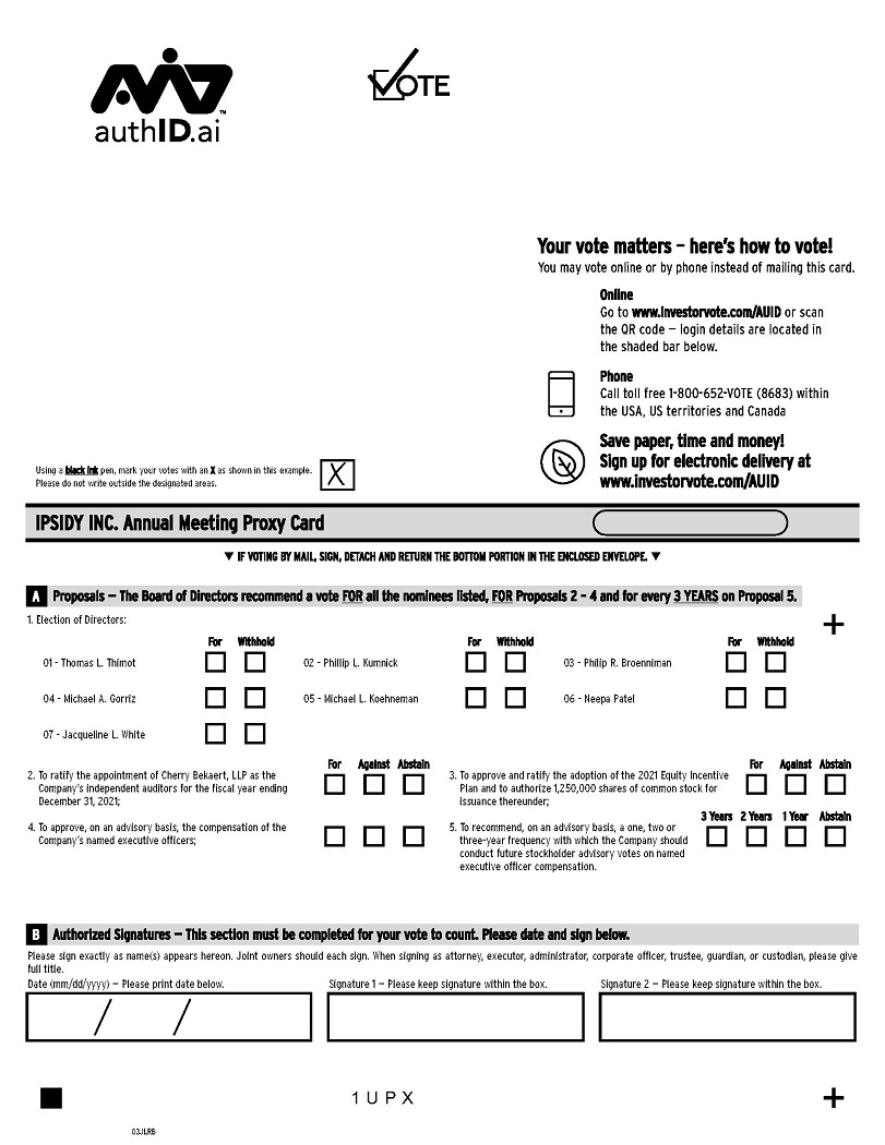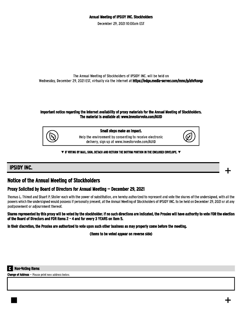 This Proxy Statement is furnished in connection with the solicitation of proxies by the Board of Directors of Ipsidy Inc. dba auithID.ai (“authID.ai” “Ipsidy” or the “Company”) to be voted at the Annual Meeting of Stockholders (the “Annual Meeting”) which will be held virtually via webcast on December 29, 2021, at 10:00 a.m. Eastern Time, and at any postponements or adjournments thereof. The proxy materials will be furnished to stockholders on or about November 19, 2021.