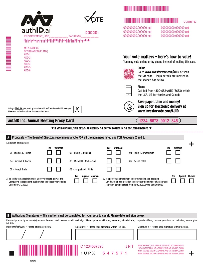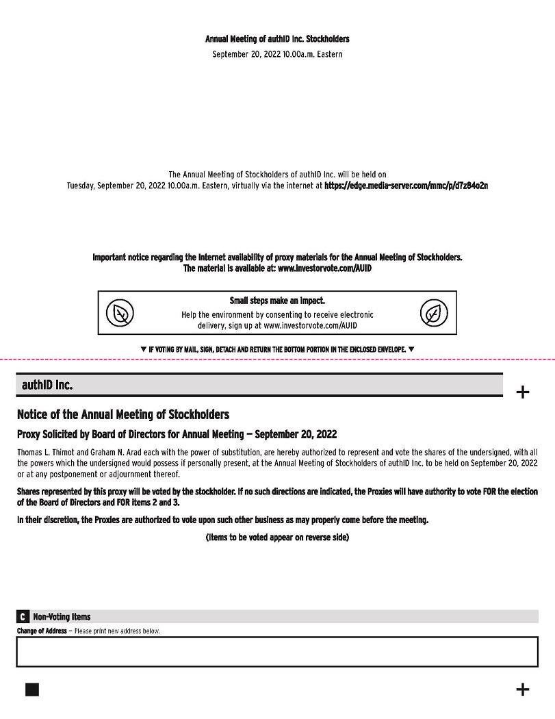 The 2022 Annual Meeting of Stockholders (the “Annual Meeting”) of authID Inc. (“authID” or the “Company”) will be held virtually by webcast, on September 20, 2022, at 10:00 a.m. Eastern Time, to consider the below proposals. Due to the public health impact of the coronavirus outbreak (COVID-19) and to support the health and well-being of our employees and stockholders, the Annual Meeting will be held in a virtual meeting format at https://edge.media-server.com/mmc/p/d7z84o2n.