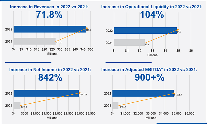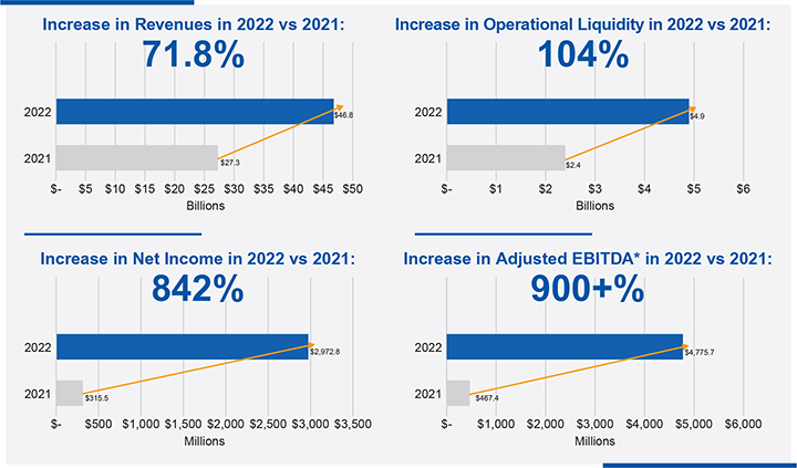 | ● | Record Revenues, Net Income and Adjusted EBITDA. In 2022, we achieved record revenues of $46.8 billion in 2022, an increase of 71.8% from $27.3 billion in 2021, our net income increased to $2,972.8 million in 2022 from $315.5 million in 2021, and our Adjusted EBITDA increased by over 900% from $467.4 million in 2021 to $4,775.7 million in 2022. |