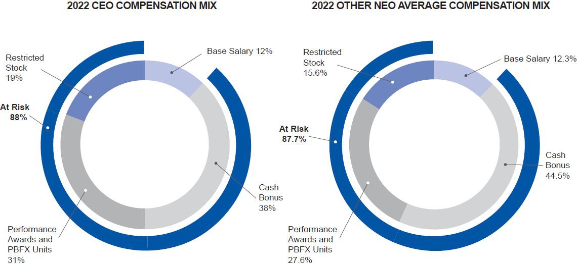 Our fiscal 2022 executive compensation program aligns compensation with management's execution of the Company's most important financial and strategic objectives. Our executive compensation program reflects our compensation philosophy that executive pay should be heavily weighted towards variable and at-risk compensation to ensure that management's pay is directly tied to key results and stockholder value creation.