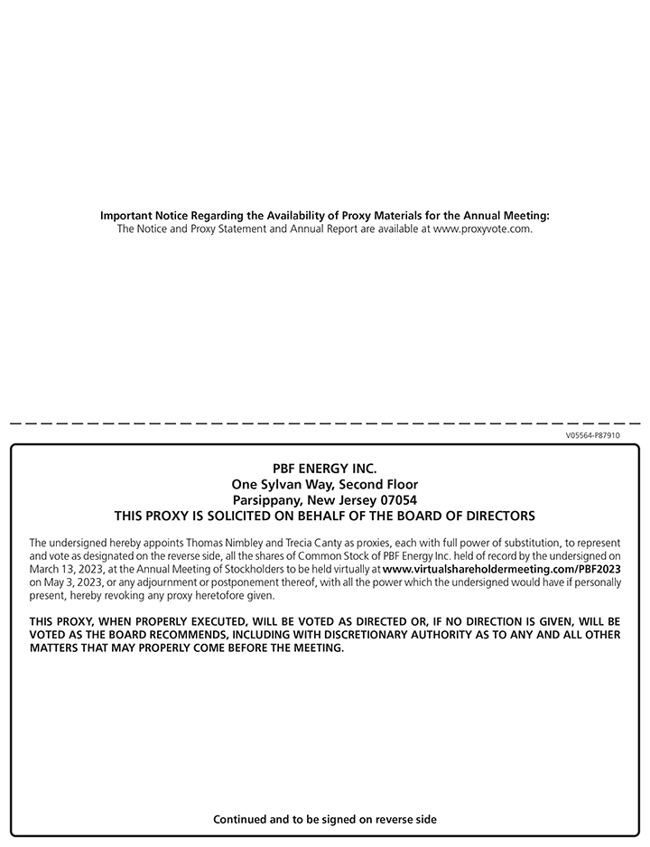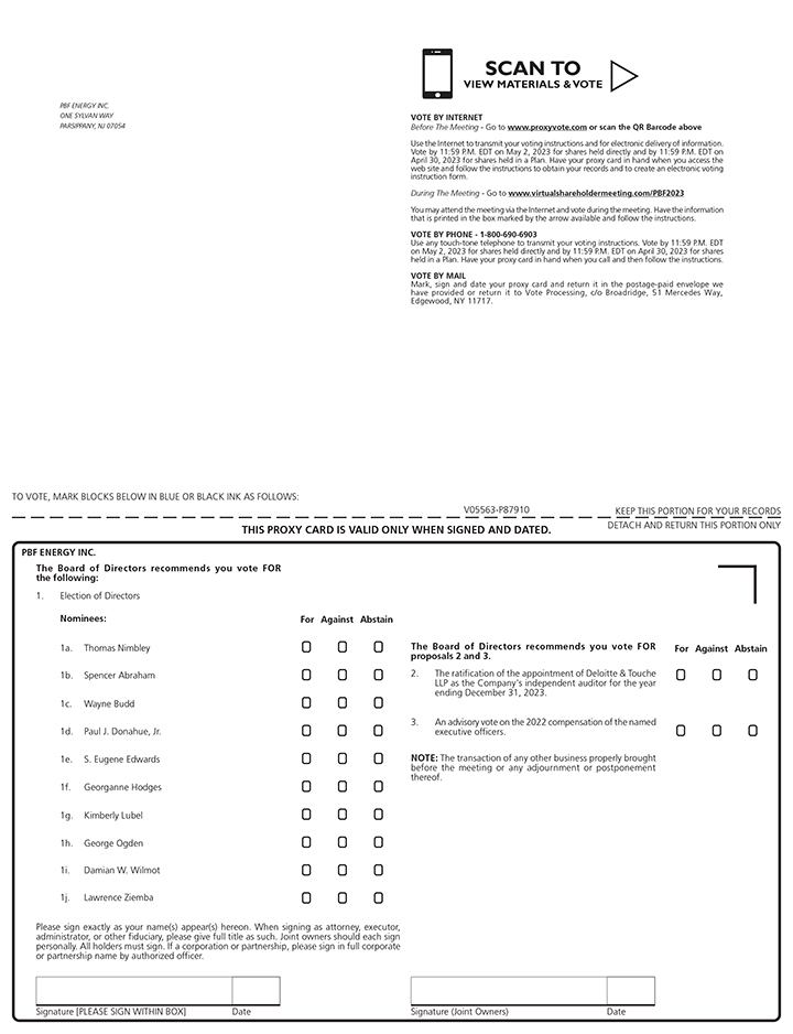 The 2023 Annual Meeting will be held exclusively online at www.virtualshareholdermeeting.com/PBF2023. Stockholders of record at the close of business on March 13, 2023 may vote at the meeting or any postponements or adjournments of the meeting. To join as a stockholder, you must enter the 16-digit control number on your proxy card, voting instruction form, or Notice of Internet Availability you receive. During the meeting stockholders may ask questions, examine our stockholder list and vote their shares (other than shares held through employee benefit plans, which must be voted prior to the meeting). Other interested parties may join the meeting as a guest, in which case no control number is required. For more information, please see the section entitled “Annual Meeting of Stockholders” in this Proxy Statement. We are making the Proxy Statement and the form of proxy first available beginning on or about March 21, 2023.
