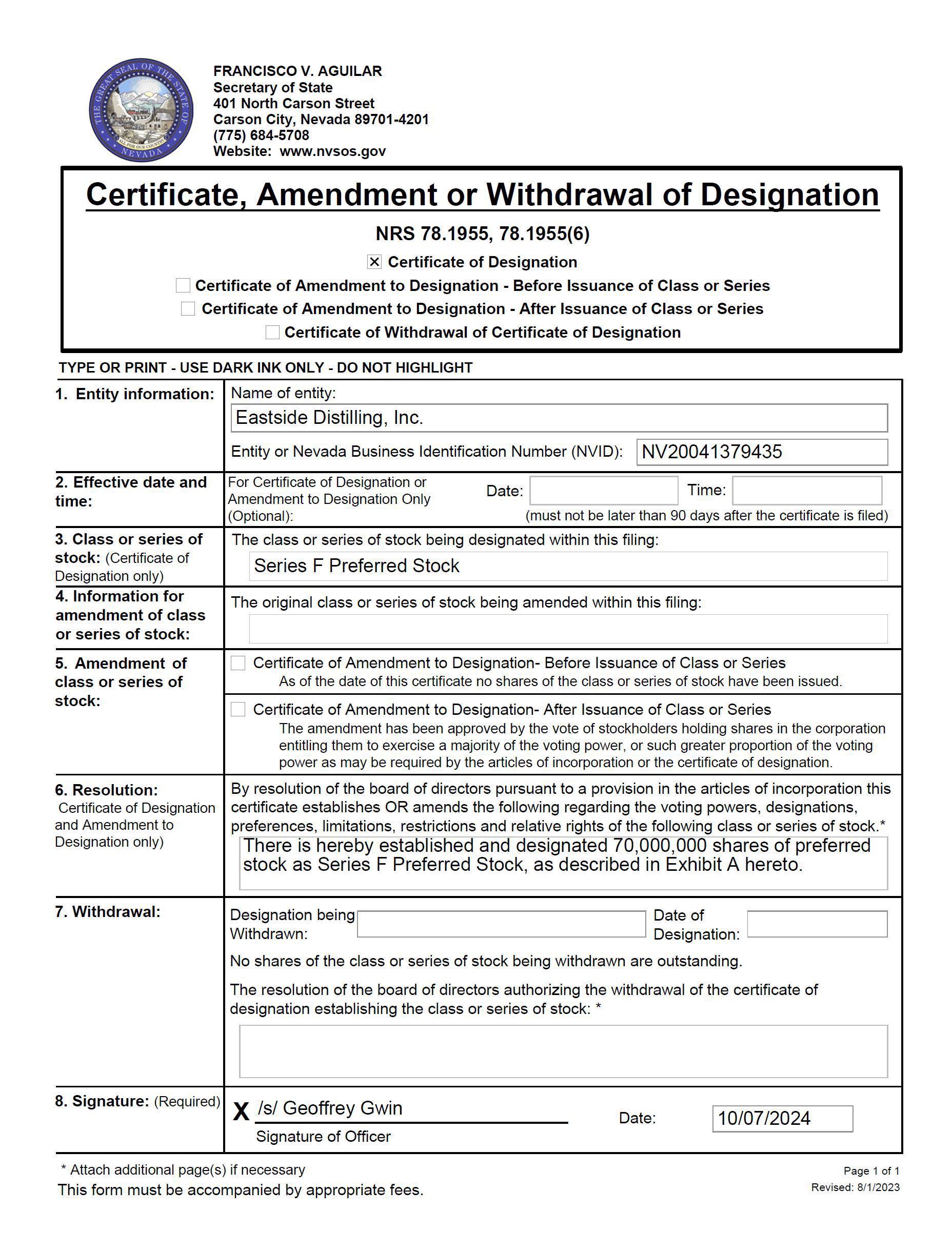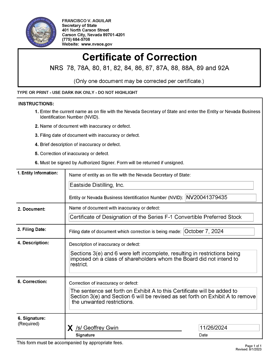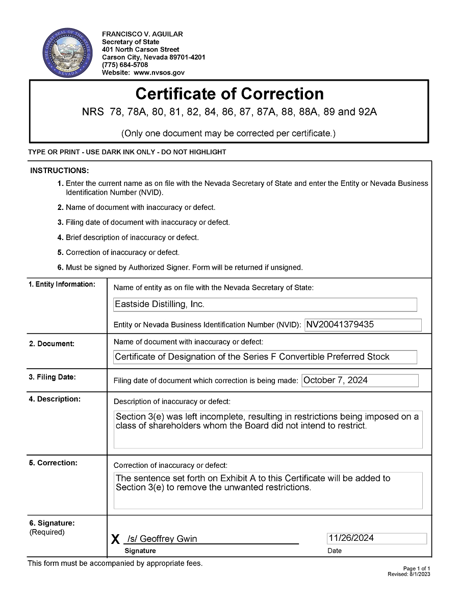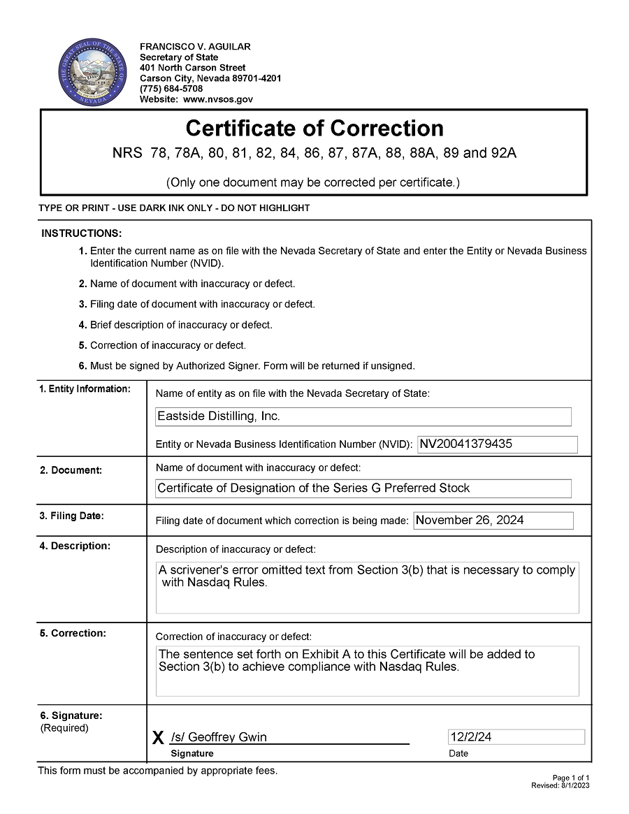 Eastside Distilling, Inc. (the “Corporation”), a corporation organized and existing under and by virtue of the Laws of the State of Nevada, does hereby certify: