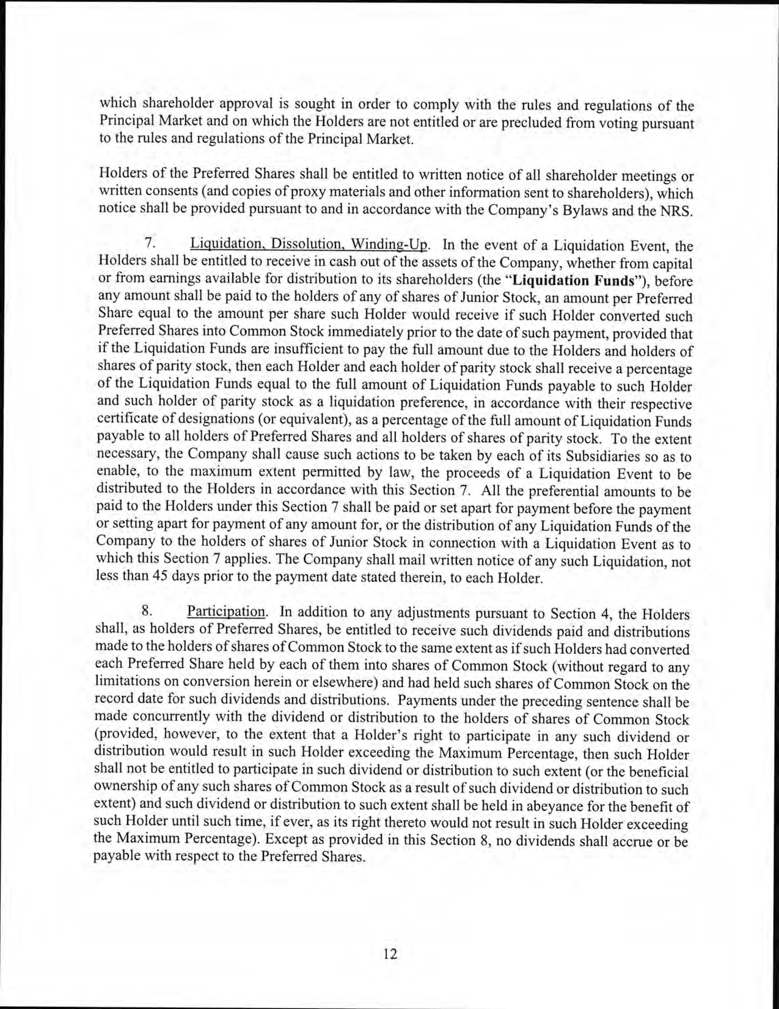 | 3. | Approval of the increase in the Common Stock issuable under our Series G and Warrants | Majority of the shares present and entitled to vote | |