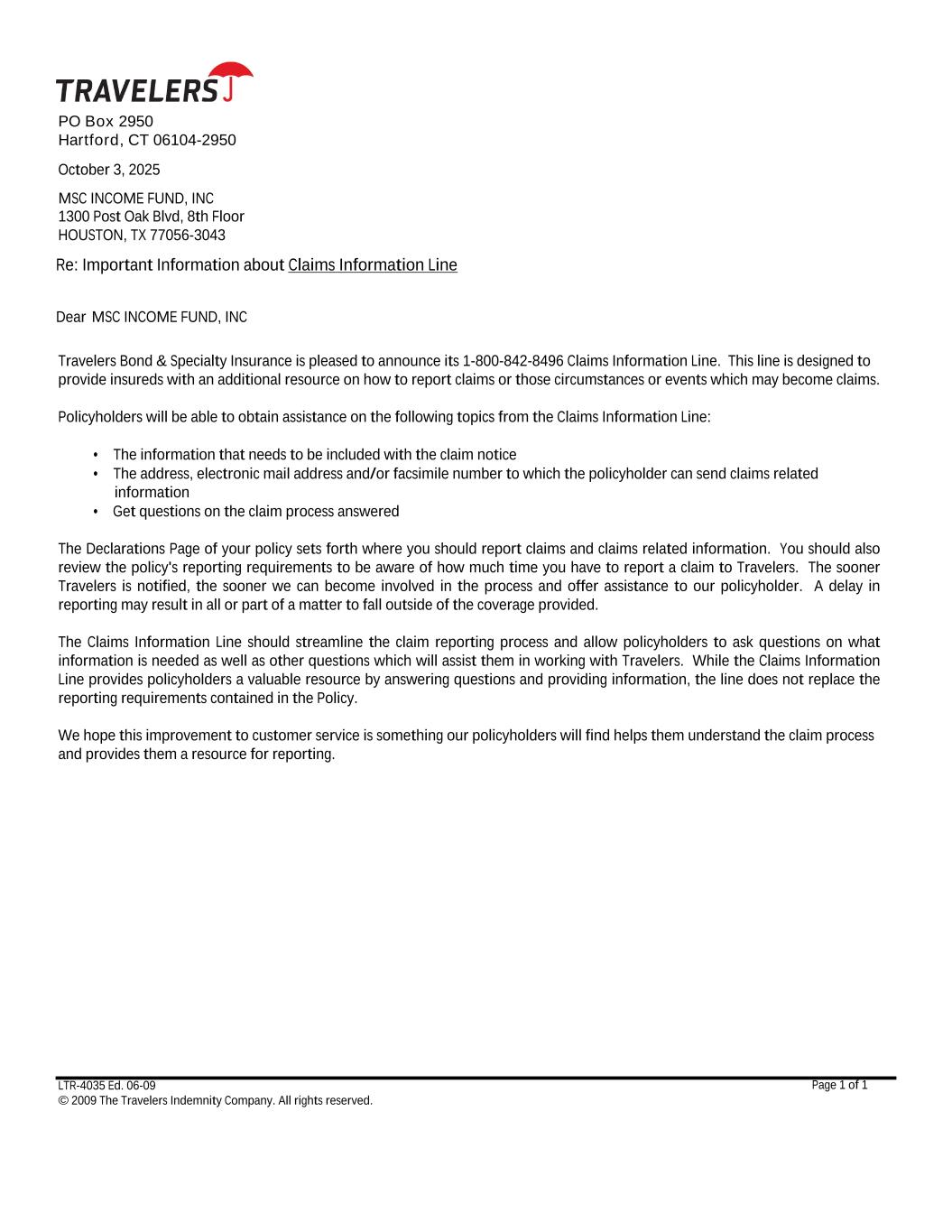 LTR-4035 Ed. 06-09 © 2009 The Travelers Indemnity Company. All rights reserved. Page 1 of 1 PO Box 2950 Hartford, CT 06104-2950 October 3, 2025 MSC INCOME FUND, INC 1300 Post Oak Blvd, 8th Floor HOUSTON, TX 77056-3043 Re: Important Information about Claims Information Line Dear MSC INCOME FUND, INC Travelers Bond & Specialty Insurance is pleased to announce its 1-800-842-8496 Claims Information Line. This line is designed to provide insureds with an additional resource on how to report claims or those circumstances or events which may become claims. Policyholders will be able to obtain assistance on the following topics from the Claims Information Line: • The information that needs to be included with the claim notice • The address, electronic mail address and/or facsimile number to which the policyholder can send claims related information • Get questions on the claim process answered The Declarations Page of your policy sets forth where you should report claims and claims related information. You should also review the policy's reporting requirements to be aware of how much time you have to report a claim to Travelers. The sooner Travelers is notified, the sooner we can become involved in the process and offer assistance to our policyholder. A delay in reporting may result in all or part of a matter to fall outside of the coverage provided. The Claims Information Line should streamline the claim reporting process and allow policyholders to ask questions on what information is needed as well as other questions which will assist them in working with Travelers. While the Claims Information Line provides policyholders a valuable resource by answering questions and providing information, the line does not replace the reporting requirements contained in the Policy. We hope this improvement to customer service is something our policyholders will find helps them understand the claim process and provides them a resource for reporting.