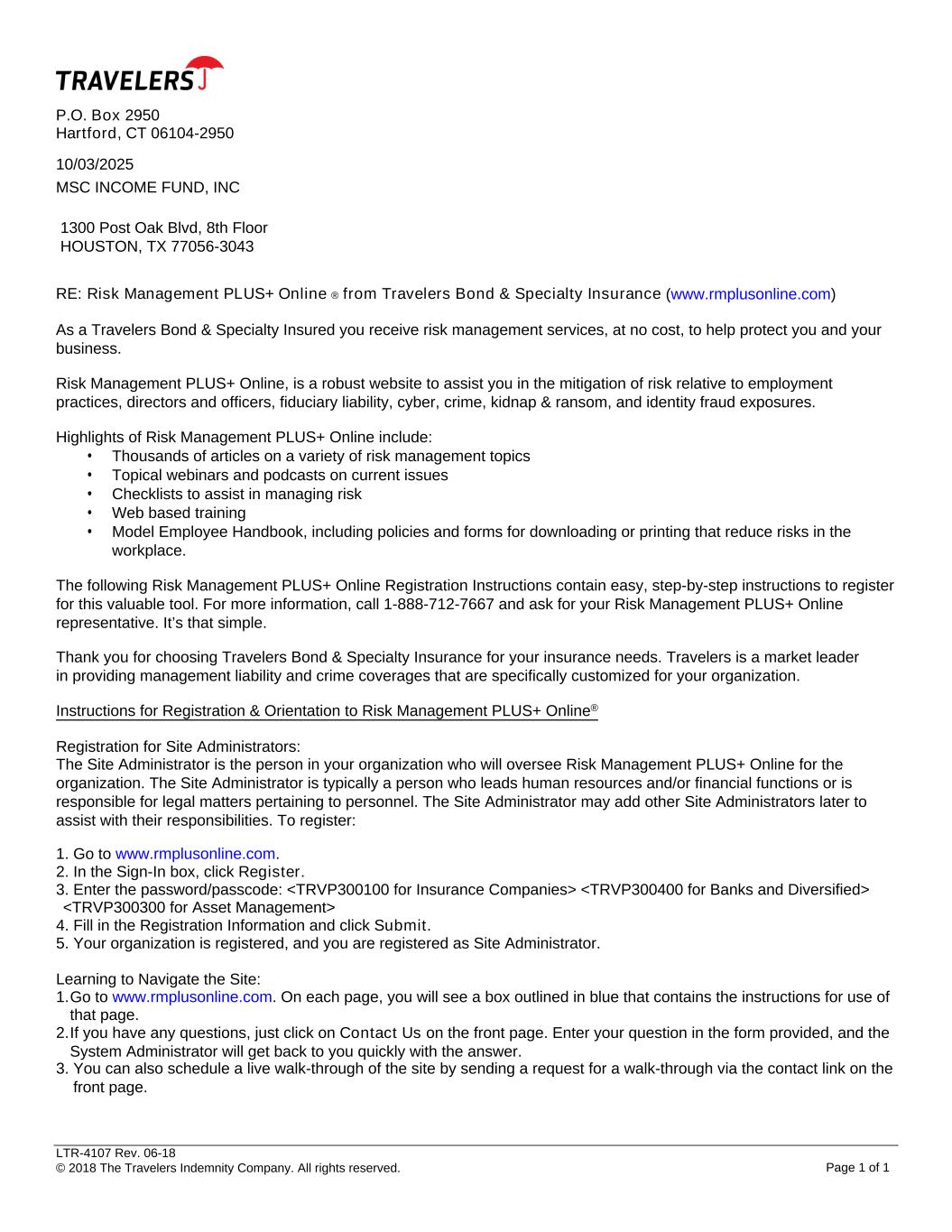 LTR-4107 Rev. 06-18 © 2018 The Travelers Indemnity Company. All rights reserved. Page 1 of 1 P.O. Box 2950 Hartford, CT 06104-2950 RE: Risk Management PLUS+ Online ® from Travelers Bond & Specialty Insurance (www.rmplusonline.com) As a Travelers Bond & Specialty Insured you receive risk management services, at no cost, to help protect you and your business. Risk Management PLUS+ Online, is a robust website to assist you in the mitigation of risk relative to employment practices, directors and officers, fiduciary liability, cyber, crime, kidnap & ransom, and identity fraud exposures. Highlights of Risk Management PLUS+ Online include: • Thousands of articles on a variety of risk management topics • Topical webinars and podcasts on current issues • Checklists to assist in managing risk • Web based training • Model Employee Handbook, including policies and forms for downloading or printing that reduce risks in the workplace. The following Risk Management PLUS+ Online Registration Instructions contain easy, step-by-step instructions to register for this valuable tool. For more information, call 1-888-712-7667 and ask for your Risk Management PLUS+ Online representative. It’s that simple. Thank you for choosing Travelers Bond & Specialty Insurance for your insurance needs. Travelers is a market leader in providing management liability and crime coverages that are specifically customized for your organization. Instructions for Registration & Orientation to Risk Management PLUS+ Online® Registration for Site Administrators: The Site Administrator is the person in your organization who will oversee Risk Management PLUS+ Online for the organization. The Site Administrator is typically a person who leads human resources and/or financial functions or is responsible for legal matters pertaining to personnel. The Site Administrator may add other Site Administrators later to assist with their responsibilities. To register: 1. Go to www.rmplusonline.com. 2. In the Sign-In box, click Register. 3. Enter the password/passcode: <TRVP300100 for Insurance Companies> <TRVP300400 for Banks and Diversified> <TRVP300300 for Asset Management> 4. Fill in the Registration Information and click Submit. 5. Your organization is registered, and you are registered as Site Administrator. Learning to Navigate the Site: 1.Go to www.rmplusonline.com. On each page, you will see a box outlined in blue that contains the instructions for use of that page. 2.If you have any questions, just click on Contact Us on the front page. Enter your question in the form provided, and the System Administrator will get back to you quickly with the answer. 3. You can also schedule a live walk-through of the site by sending a request for a walk-through via the contact link on the front page. 10/03/2025 MSC INCOME FUND, INC 1300 Post Oak Blvd, 8th Floor HOUSTON, TX 77056-3043