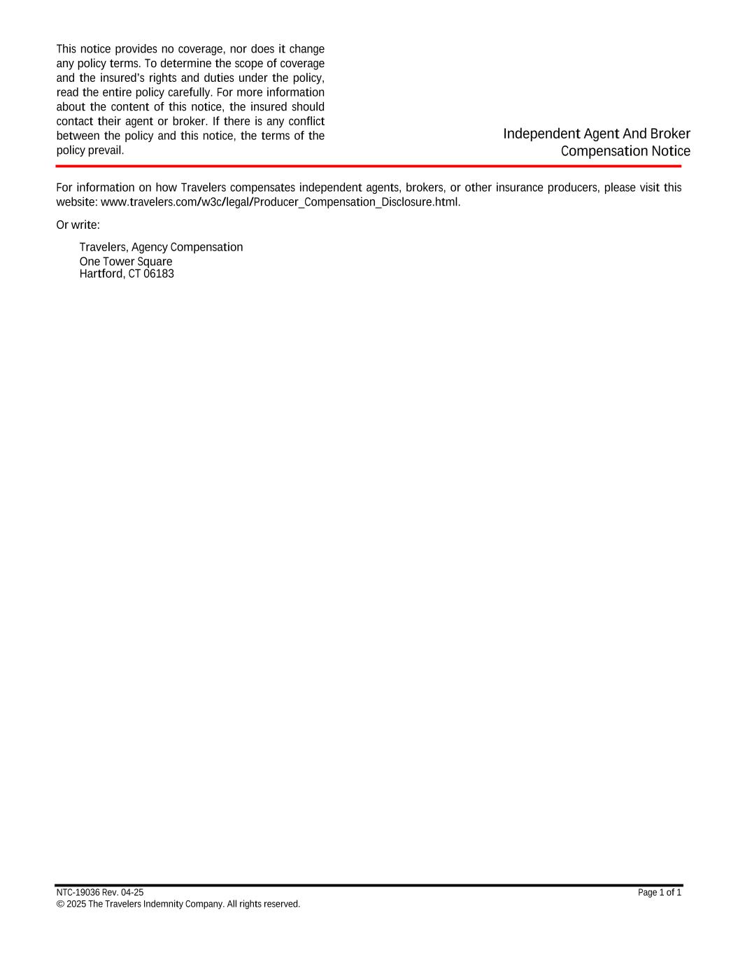 NTC-19036 Rev. 04-25 © 2025 The Travelers Indemnity Company. All rights reserved. Page 1 of 1 This notice provides no coverage, nor does it change any policy terms. To determine the scope of coverage and the insured’s rights and duties under the policy, read the entire policy carefully. For more information about the content of this notice, the insured should contact their agent or broker. If there is any conflict between the policy and this notice, the terms of the policy prevail. Independent Agent And Broker Compensation Notice For information on how Travelers compensates independent agents, brokers, or other insurance producers, please visit this website: www.travelers.com/w3c/legal/Producer_Compensation_Disclosure.html. Or write: Travelers, Agency Compensation One Tower Square Hartford, CT 06183