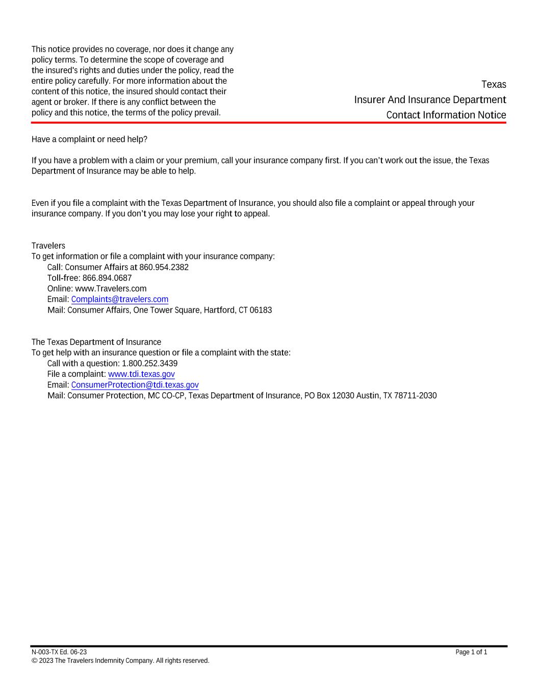 N-003-TX Ed. 06-23 Page 1 of 1 © 2023 The Travelers Indemnity Company. All rights reserved. This notice provides no coverage, nor does it change any policy terms. To determine the scope of coverage and the insured's rights and duties under the policy, read the entire policy carefully. For more information about the content of this notice, the insured should contact their agent or broker. If there is any conflict between the policy and this notice, the terms of the policy prevail. Texas Insurer And Insurance Department Contact Information Notice Have a complaint or need help? If you have a problem with a claim or your premium, call your insurance company first. If you can’t work out the issue, the Texas Department of Insurance may be able to help. Even if you file a complaint with the Texas Department of Insurance, you should also file a complaint or appeal through your insurance company. If you don’t you may lose your right to appeal. Travelers To get information or file a complaint with your insurance company: Call: Consumer Affairs at 860.954.2382 Toll-free: 866.894.0687 Online: www.Travelers.com Email: Complaints@travelers.com Mail: Consumer Affairs, One Tower Square, Hartford, CT 06183 The Texas Department of Insurance To get help with an insurance question or file a complaint with the state: Call with a question: 1.800.252.3439 File a complaint: www.tdi.texas.gov Email: ConsumerProtection@tdi.texas.gov Mail: Consumer Protection, MC CO-CP, Texas Department of Insurance, PO Box 12030 Austin, TX 78711-2030