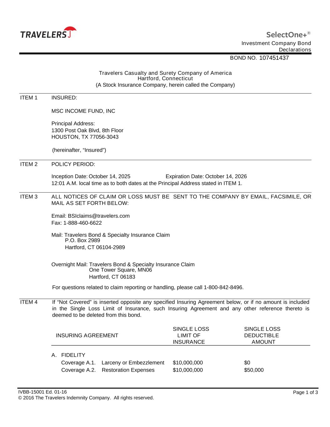 IVBB-15001 Ed. 01-16 © 2016 The Travelers Indemnity Company. All rights reserved. Page 1 of 3 Investment Company Bond Declarations BOND NO. 107451437 Travelers Casualty and Surety Company of America Hartford, Connecticut (A Stock Insurance Company, herein called the Company) ITEM 1 INSURED: MSC INCOME FUND, INC Principal Address: 1300 Post Oak Blvd, 8th Floor HOUSTON, TX 77056-3043 (hereinafter, “Insured”) ITEM 2 POLICY PERIOD: Inception Date: October 14, 2025 Expiration Date: October 14, 2026 12:01 A.M. local time as to both dates at the Principal Address stated in ITEM 1. ITEM 3 ALL NOTICES OF CLAIM OR LOSS MUST BE SENT TO THE COMPANY BY EMAIL, FACSIMILE, OR MAIL AS SET FORTH BELOW: Email: BSIclaims@travelers.com Fax: 1-888-460-6622 Mail: Travelers Bond & Specialty Insurance Claim P.O. Box 2989 Hartford, CT 06104-2989 Overnight Mail: Travelers Bond & Specialty Insurance Claim One Tower Square, MN06 Hartford, CT 06183 For questions related to claim reporting or handling, please call 1-800-842-8496. ITEM 4 If “Not Covered” is inserted opposite any specified Insuring Agreement below, or if no amount is included in the Single Loss Limit of Insurance, such Insuring Agreement and any other reference thereto is deemed to be deleted from this bond. INSURING AGREEMENT SINGLE LOSS LIMIT OF INSURANCE SINGLE LOSS DEDUCTIBLE AMOUNT A. FIDELITY Coverage A.1. Larceny or Embezzlement $10,000,000 $0 Coverage A.2. Restoration Expenses $10,000,000 $50,000