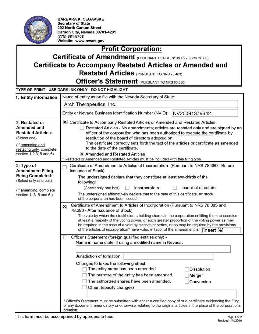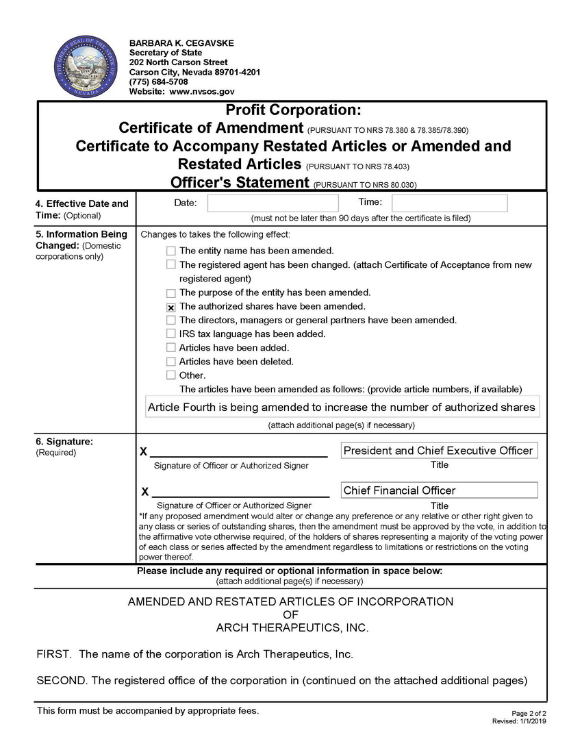 FIRST. The name of the corporation is Arch Therapeutics, Inc.