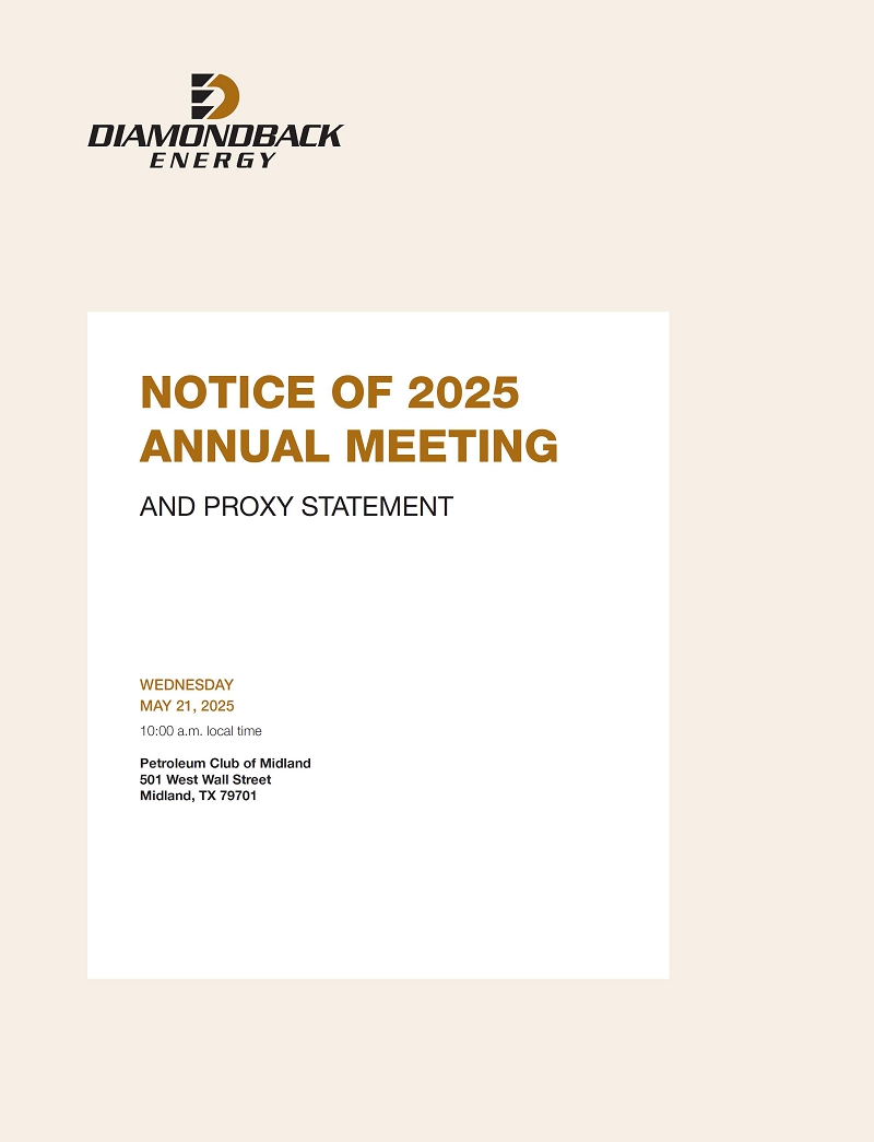 The Annual Meeting of Stockholders of Diamondback Energy, Inc. will be held on May 21, 2025, at 10:00 a.m., local time, at the Petroleum Club of Midland, 501 West Wall Street, Midland, TX 79701, for the following purposes: