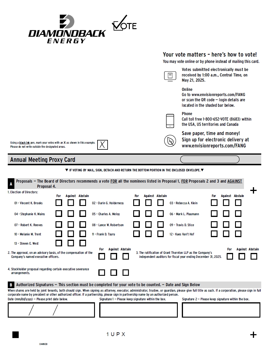 Annual Meeting Proxy Card IF VOTING BY MAIL, SIGN, DETACH AND RETURN THE BOTTOM PORTION IN THE ENCLOSED ENVELOPE. Proposals — The Board of Directors recommends a vote FOR all the nominees listed in Proposal 1, FOR Proposals 2 and 3 and AGAINST Proposal 4. 1. Election of Directors: For Against Abstain For Against Abstain For Against Abstain 01 -Vincent K. Brooks 02 -Darin G. Holderness 03 -Rebecca A. Klein 04 -Stephanie K. Mains 05 -Charles A. Meloy 06 -Mark L. Plaumann 07 -Robert K. Reeves 08 -Lance W. Robertson 09 -Travis D. Stice 10 -Melanie M. Trent 11 -Frank D. Tsuru 12 -Kaes Van’t Hof 13 -Steven E. West For Against Abstain Using a black ink pen, mark your votes with an X as shown in this example. Please do not write outside the designated areas. Your vote matters – here’s how to vote! You may vote online or by phone instead of mailing this card. Votes submitted electronically must be received by 1:00 a.m., Central Time, on May 21, 2025. Online Go to www.envisionreports.com/FANG or scan the QR code — login details are located in the shaded bar below. Phone Call toll free 1-800-652-VOTE (8683) within the USA, US territories and Canada Save paper, time and money! Sign up for electronic delivery at www.envisionreports.com/FANG 1UPX 044NOB