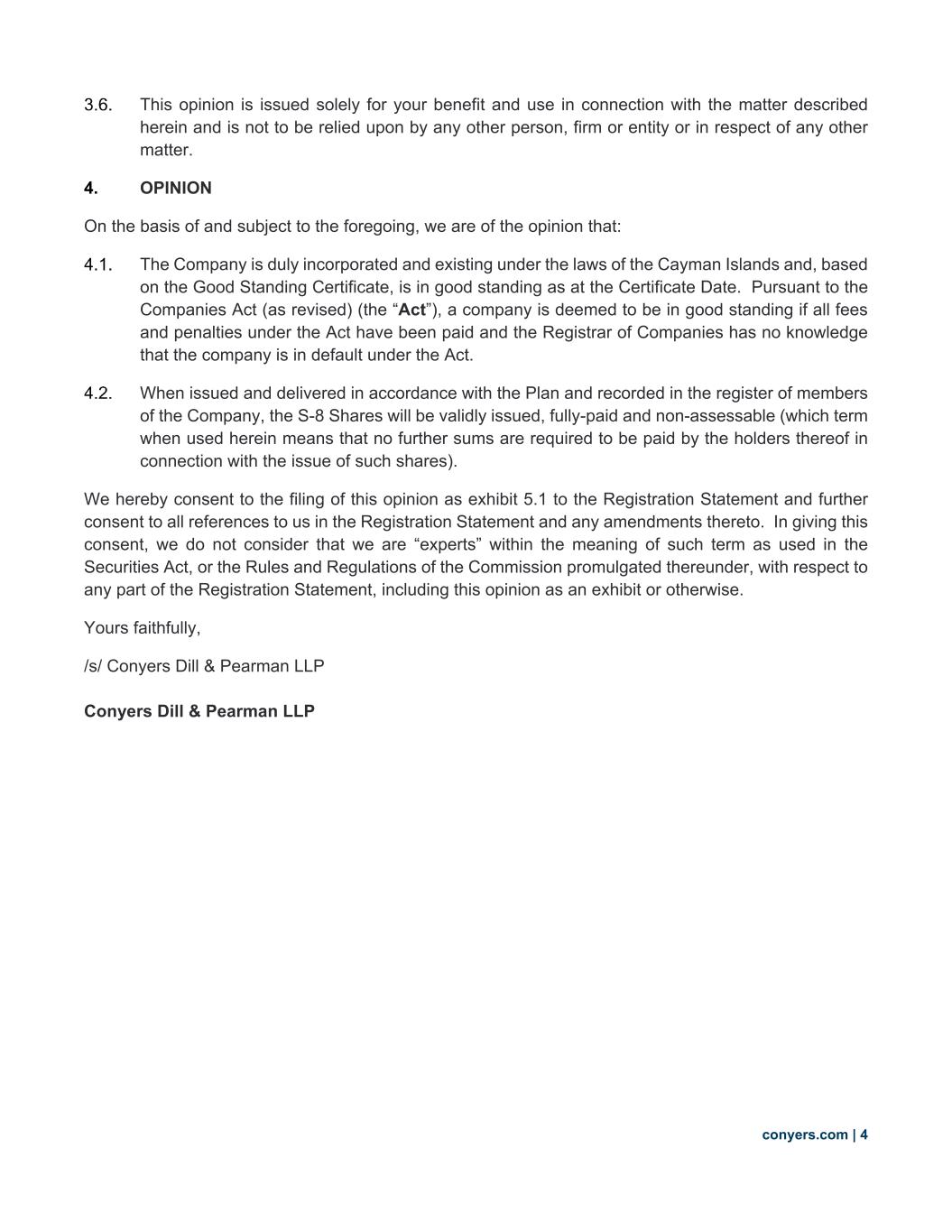 conyers.com | 4 This opinion is issued solely for your benefit and use in connection with the matter described herein and is not to be relied upon by any other person, firm or entity or in respect of any other matter. 4. OPINION On the basis of and subject to the foregoing, we are of the opinion that: The Company is duly incorporated and existing under the laws of the Cayman Islands and, based on the Good Standing Certificate, is in good standing as at the Certificate Date. Pursuant to the Companies Act (as revised) (the “Act”), a company is deemed to be in good standing if all fees and penalties under the Act have been paid and the Registrar of Companies has no knowledge that the company is in default under the Act. When issued and delivered in accordance with the Plan and recorded in the register of members of the Company, the S-8 Shares will be validly issued, fully-paid and non-assessable (which term when used herein means that no further sums are required to be paid by the holders thereof in connection with the issue of such shares). We hereby consent to the filing of this opinion as exhibit 5.1 to the Registration Statement and further consent to all references to us in the Registration Statement and any amendments thereto. In giving this consent, we do not consider that we are “experts” within the meaning of such term as used in the Securities Act, or the Rules and Regulations of the Commission promulgated thereunder, with respect to any part of the Registration Statement, including this opinion as an exhibit or otherwise. Yours faithfully, /s/ Conyers Dill & Pearman LLP Conyers Dill & Pearman LLP