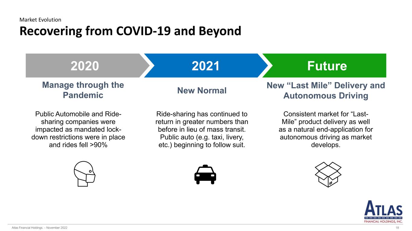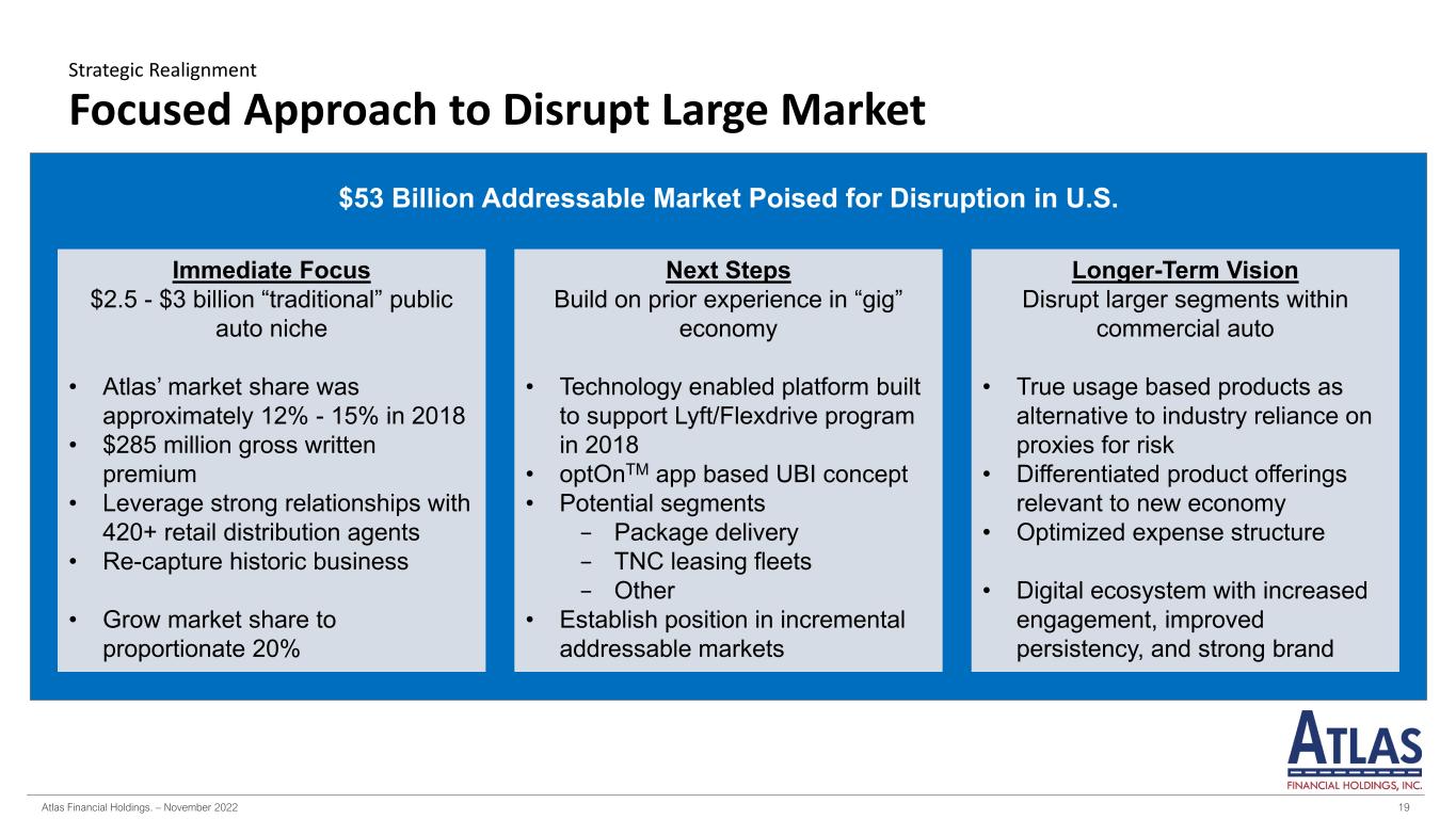 Atlas Financial Holdings. – November 2022 18 Recovering from COVID-19 and Beyond Market Evolution Manage through the Pandemic Public Automobile and Ride- sharing companies were impacted as mandated lock- down restrictions were in place and rides fell >90% New Normal Ride-sharing has continued to return in greater numbers than before in lieu of mass transit. Public auto (e.g. taxi, livery, etc.) beginning to follow suit. New “Last Mile” Delivery and Autonomous Driving Consistent market for “Last- Mile” product delivery as well as a natural end-application for autonomous driving as market develops. 2020 2021 Future