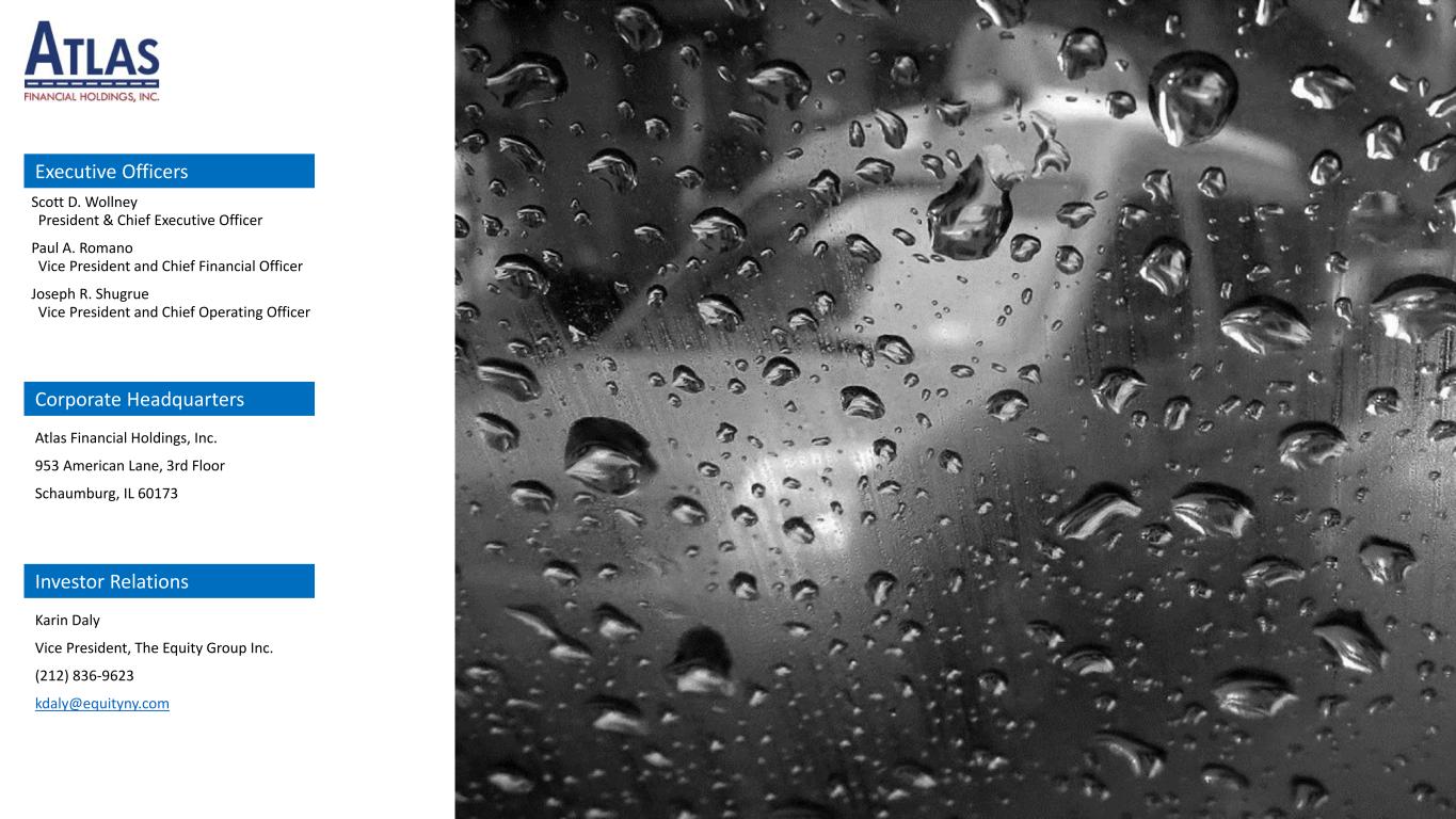 Atlas Financial Holdings, Inc. 953 American Lane, 3rd Floor Schaumburg, IL 60173 Corporate Headquarters Scott D. Wollney President & Chief Executive Officer Paul A. Romano Vice President and Chief Financial Officer Joseph R. Shugrue Vice President and Chief Operating Officer Executive Officers Karin Daly Vice President, The Equity Group Inc. (212) 836-9623 kdaly@equityny.com Investor Relations