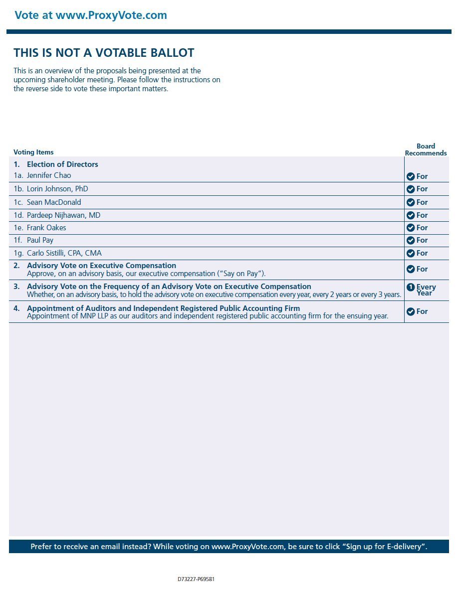 Our Board of Directors unanimously recommends that the shareholders vote “FOR” each of the nominees for Director, “FOR” endorsement of the compensation of our executive officers, for a “say on pay” frequency of “Every Year” and “FOR” the appointment of MNP LLP as our auditors and independent registered public accounting firm for the ensuing year.