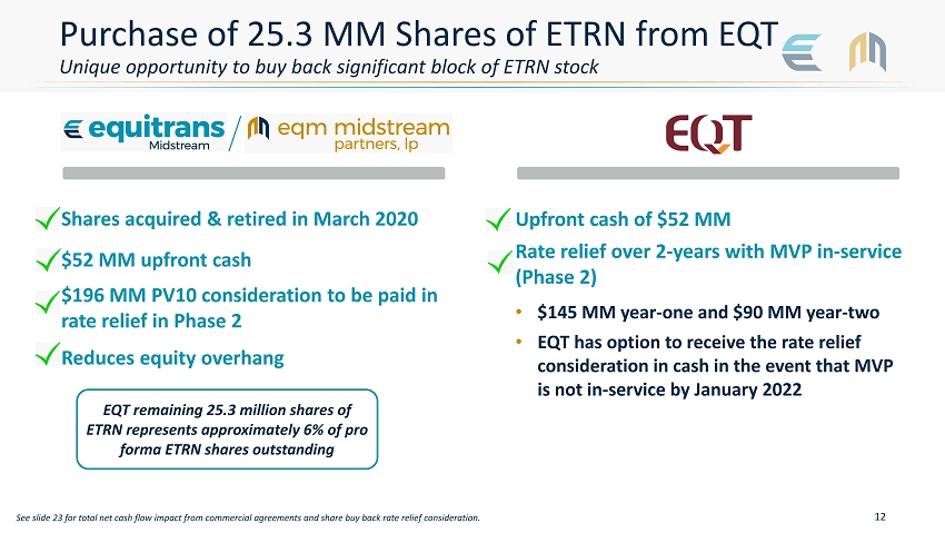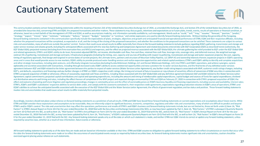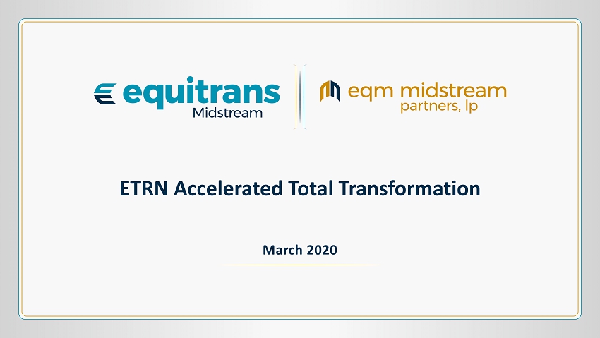 This communication contains certain forward - looking statements within the meaning of Section 21E of the United States Securities Exchange Act of 1934, as amended (the Exchange Act), and Section 27A of the United States Securities Act of 1933, as amended (the Securities Act), concerning ETRN and EQM, the proposed transactions and other matters. These statements may disc uss goals, intentions and expectations as to future plans, trends, events, results of operations or financial condition, or otherwise, based on current beliefs of the management of ETRN and EQM, as well as assumptions made by, and information curren tly available to, such management. Words such as “could,” “will,” “may,” “assume,” “forecast,” “position,” “predict,” “strategy,” “expect,” “intend,” “plan,” “estimate,” “anticipate,” “believe,” “project,” “budget,” “potential,” or “continue,” an d similar expressions are used to identify forward - looking statements. Without limiting the generality of the foregoing, forward - looking statements contained in this communication specifically include the expectations of plans, strategies, objective s and growth and anticipated financial and operational performance of ETRN, EQM and their respective affiliates, including whether the proposed transactions will be completed, as expected or at all, and the timing of the closing of the proposed tra nsa ctions; and whether the conditions to the proposed transactions can be satisfied. These statements are subject to various risks and uncertainties, many of which are outside the parties’ control. Factors that could cause actual results to differ m ate rially from those in the forward - looking statements include guidance regarding EQM's gathering, transmission and storage and water service revenue and volume growth, including the anticipated effects associated with the new Gas Gathering and Compress ion Agreement and related documents entered into with EQT Corporation (EQT) as described herein (collectively, the EQT Global GGA); projected revenue (including from firm reservation fees and MVCs) and expenses, and the effect on projected rev enue associated with the EQT Global GGA; the ultimate gathering fee relief provided to EQT under the EQT Global GGA and related agreements; ETRN’s and EQM’s ability to de - lever; forecasted adjusted EBITDA, net income, distributable cash flow, f ree cash flow, retained free cash flow, leverage ratio, coverage ratio, and deferred revenue; the weighted average contract life of gathering, transmission and storage contracts; infrastructure programs (including the timing, cost, capacity an d sources of funding with respect to gathering, transmission and storage and water expansion projects); the cost, capacity, timing of regulatory approvals, final design and targeted in - service dates of current projects; the ultimate terms, partners and structure of Mountain Valley Pipeline, LLC (MVP JV) and ownership interests therein; expansion projects in EQM's operating areas and in areas that would provide access to new markets; EQM's ability to provide produced water handling services and re ali ze expansion opportunities and related capital avoidance; ETRN’s and EQM's ability to identify and complete acquisitions and other strategic transactions, including joint ventures, and effectively integrate transactions (including Eureka Midstrea m H oldings, LLC and Hornet Midstream Holdings, LLC) into ETRN’s and EQM's operations, and achieve synergies, system optionality and accretion associated with transactions, including through increased scale; EQM's ability to access commercial op portunities and new customers for its water services business, and the final terms of any definitive water services agreement between EQT and EQM related to the letter agreement between the parties in respect of water services (Water Service s L etter Agreement); any further credit rating impacts associated with MVP, customer credit ratings changes, including EQT's, and defaults, acquisitions and financings and any further changes in ETRN’s or EQM’s respective credit ratings; the ti min g and amount of future issuances or repurchases of securities; effects of conversion of EQM securities in connection with ETRN’s proposed acquisition of EQM or otherwise; effects of seasonality; expected cash flows and MVCs, including those associ ate d with the EQT Global GGA and any definitive agreement between EQT and EQM related to the Water Services Letter Agreement; capital commitments; projected capital contributions and capital and operating expenditures, including the amount and timing of reimbursable capital expenditures, capital budget and sources of funds for capital expenditures; dividend and distribution amounts and timing and rates, including the effect thereon of completion of the MVP project and expected cha nge s announced by ETRN and EQM on February 27, 2020 in connection with ETRN’s proposed acquisition of EQM; the effect and outcome of pending and future litigation and regulatory proceedings; changes in commodity prices and the effect of co mmodity prices on EQM's business; liquidity and financing requirements, including sources and availability; interest rates; ETRN’s, EQM’s and EQM’s subsidiaries’ respective abilities to service debt under, and comply with the covenants contained in, th eir respective credit agreements; expectations regarding production volumes in EQM's areas of operations; ETRN’s and EQM’s abilities to achieve the anticipated benefits associated with the execution of the EQT Global GGA and the Water Service s L etter Agreement; the effects of government regulation; and tax status and position. These forward - looking statements involve risks and uncertainties that could cause actual results to differ materially from projected results. Accordingly, investors should not place undue reliance on forward - looking statemen