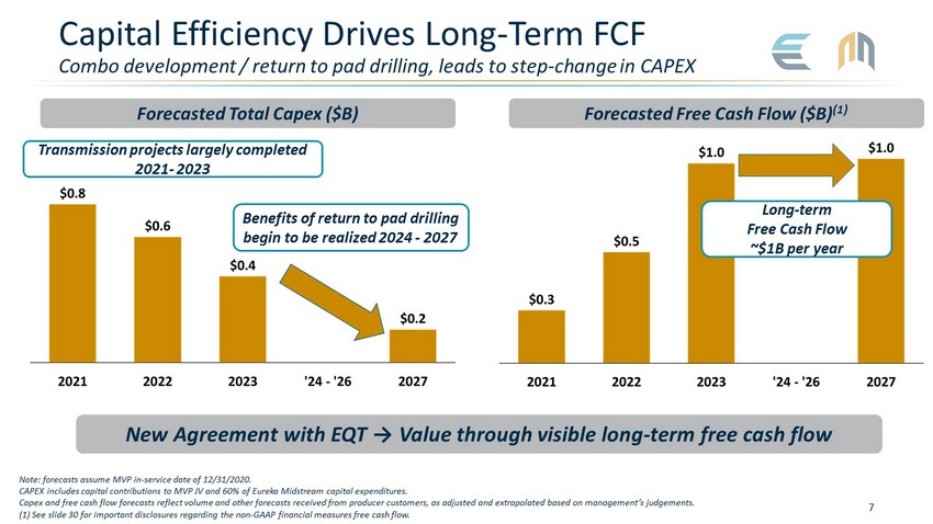 Gas Gathering Agreement 6 Significant step - up and extension of gathering MVC drives predictable cash flows New EQT MVC covers Pennsylvania and West Virginia volumes Assumes 12/31/2020 MVP in - service. Present value based on a 10% discount rate. Prior EQT MVCs include firm reservation commitments. MVC Revenue PV - 10 Prior EQT MVCs = $2.8 B Phase 1 = $4.7 B Phase 2 = $4.9 B Phase 2 MVC Phase 1 MVC
