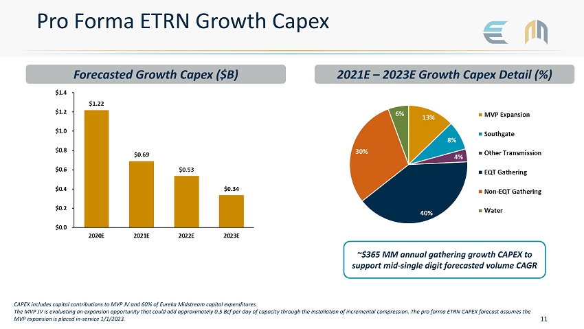 Gas Gathering Agreement 10 Combo development provides midstream capital efficiencies Systematic buildout of gas gathering system yields midstream capital efficiency • Concentrated footprint reduces overall build miles relative to scattered pad development • ~30% reduction in capital from 50% fewer pipeline miles and upsized pipe diameter from 12” to 16” • Estimated $250 MM of capital savings in 2021 - 2023 EQT choke management program results in predictable operations and enhanced midstream planning • Avoid sizing midstream facilities for short - lived peak initial production rates • Minimize back - off of nearby wells when new production comes on - line Existing gathering lines and compression Combo Development Example Step one – initial drilling plan Step two – return to pad drilling utilizes infrastructure built for step one