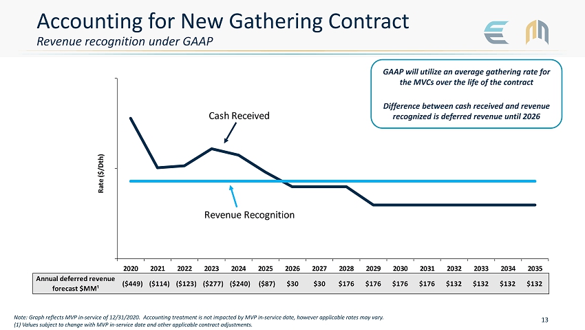 12 Unique opportunity to buy back significant block of ETRN stock Purchase of 25.3 MM Shares of ETRN from EQT Shares acquired & retired in March 2020 $52 MM upfront cash $196 MM PV10 consideration to be paid in rate relief in Phase 2 Reduces equity overhang Upfront cash of $52 MM Rate relief over 2 - years with MVP in - service (Phase 2) • $145 MM year - one and $90 MM year - two • EQT has option to receive the rate relief consideration in cash in the event that MVP is not in - service by January 2022 See slide 23 for total net cash flow impact from commercial agreements and share buy back rate relief consideration. EQT remaining 25.3 million shares of ETRN represents approximately 6% of pro forma ETRN shares outstanding