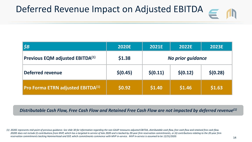 13 Revenue recognition under GAAP Accounting for New Gathering Contract Note: Graph reflects MVP in - service of 12/31/2020. Accounting treatment is not impacted by MVP in - service date, however applica ble rates may vary. (1) Values subject to change with MVP in - service date and other applicable contract adjustments. GAAP will utilize an average gathering rate for the MVCs over the life of the contract Difference between cash received and revenue recognized is deferred revenue until 2026 Annual deferred revenue forecast $MM¹ ($87)($449) ($114) ($123) ($277) ($240) $132 $132 $132 $132$30 $30 $176 $176 $176 $176 2020 2021 2022 2023 2024 2025 2026 2027 2028 2029 2030 2031 2032 2033 2034 2035 Rate ($/Dth) Cash Received Revenue Recognition