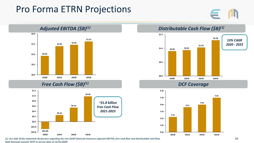 ETRN will acquire EQM in a 100% share - for - unit exchange • EQM public common unitholders will receive 2.44 shares of ETRN common stock for each common unit of EQM • ~3% premium to the 20 - day VWAP (1) EQM to become a wholly owned subsidiary of ETRN following merger Expected to close mid - 2020, subject to closing conditions and approval from ETRN shareholders and EQM unitholders 15 Roll - up transaction simplifies structure and provides multiple benefits ETRN to Acquire EQM Acquisition Terms Strategic Rationale Single C - Corp security eliminates complexity and offers improved governance ETRN anticipates near zero cash taxes through at least 2023 and minimal cash taxes through at least 2026 Creates broader investor base Increased float improves trading liquidity Enhances opportunity for index inclusion (1) Based on volume weighted average price for EQM and ETRN over the 20 - days ending February 26, 2020.