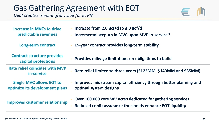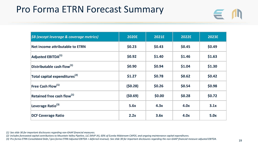 19 Pro Forma ETRN Forecast Summary (1) See slide 30 for important disclosures regarding non - GAAP financial measures. (2) Includes forecasted capital contributions to Mountain Valley Pipeline, LLC (MVP JV), 60% of Eureka Midstream CAPEX, and ongoi ng maintenance capital expenditures. (3) Pro forma ETRN Consolidated Debt / (pro forma ETRN Adjusted EBITDA + deferred revenue). See slide 30 for important disclosure s r egarding the non - GAAP financial measure adjusted EBITDA. $B (except leverage & coverage metrics) 2020E 2021E 2022E 2023E Net income attributable to ETRN $0.23 $0.43 $0.45 $0.49 Adjusted EBITDA (1) $0.92 $1.40 $1.46 $1.63 Distributable cash flow (1) $0.90 $0.94 $1.04 $1.30 Total capital expenditures (2) $1.27 $0.78 $0.62 $0.42 Free Cash Flow (1) ($0.28) $0.26 $0.54 $0.98 Retained free cash flow (1) ($0.69) $0.00 $0.28 $0.72 Leverage Ratio (3) 5.6x 4.3x 4.0x 3.1x DCF Coverage Ratio 2.2x 3.6x 4.0x 5.0x