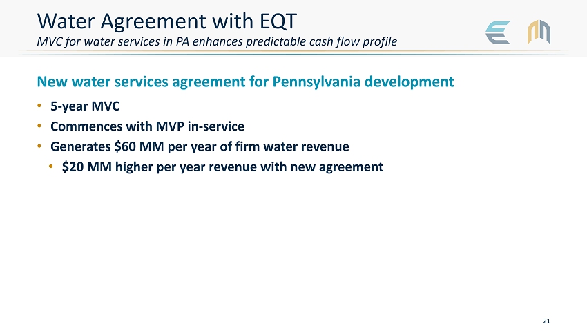New water services agreement for Pennsylvania development • 5 - year MVC • Commences with MVP in - service • Generates $60 MM per year of firm water revenue • $20 MM higher per year revenue with new agreement Water Agreement with EQT 21 MVC for water services in PA enhances predictable cash flow profile