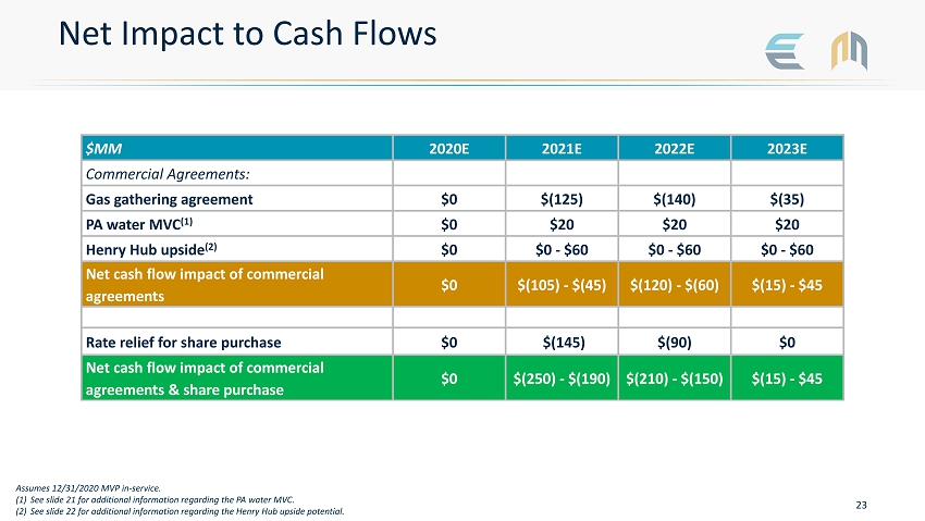 Potential for up to $60 MM per year of incremental cash flow • Applies to the 3 - year period beginning with MVP’s in - service but in no case extending beyond December 2024 EQT to pay cash to EQM in an amount equal to: • (i) 15% of every $0.01/MMBtu that the average quarterly NYMEX Henry Hub settlement price is above $2.50/MMBtu and, if applicable, above $2.70/MMBtu during any periods in 2024 multiplied by (ii) the applicable MVC volume for such quarter Henry Hub Upside 22 Structure allows EQM to participate in higher commodity price environment